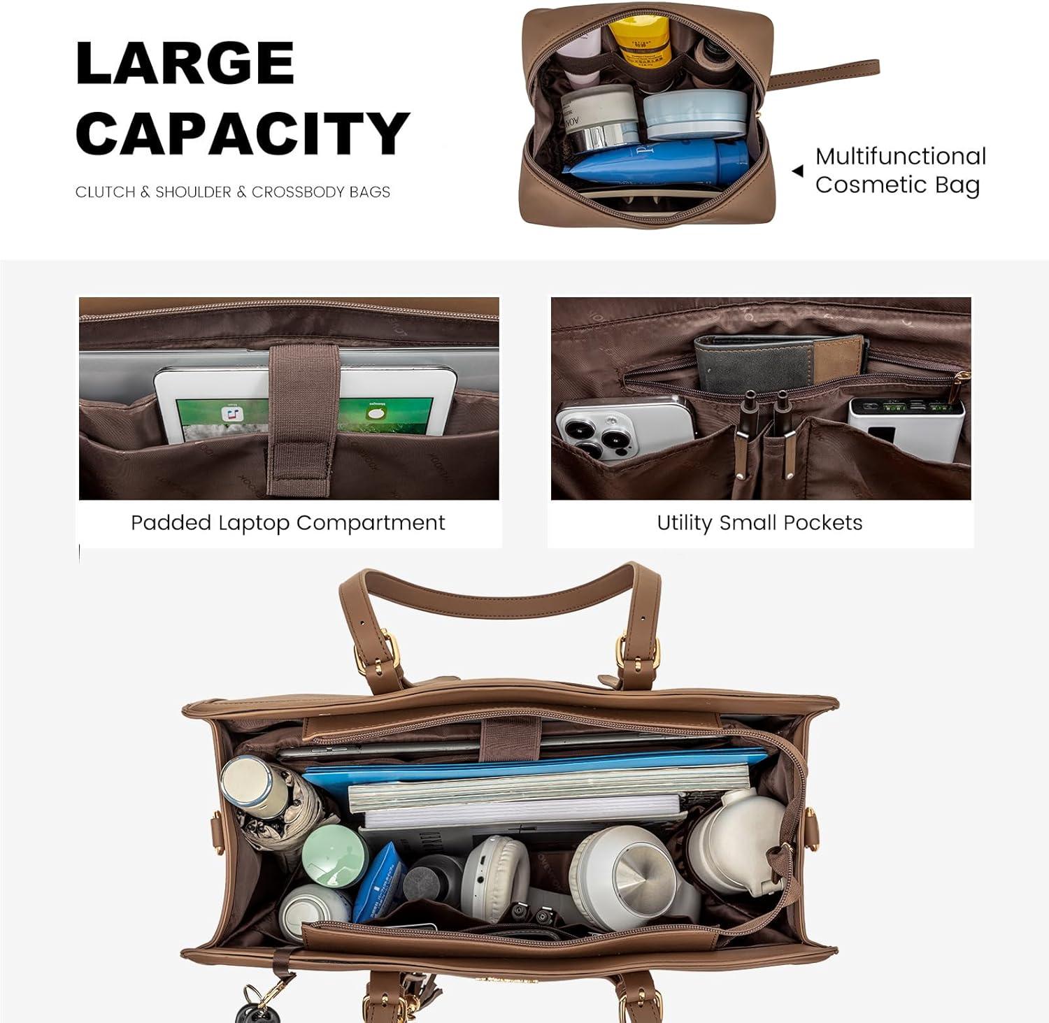 【Large Capacity】The measure of computer bags for women : 16.2*7.1 *11.5 inches. Independent padded laptop compartment, give laptop the best protection. The main compartment has ample space for books, ipad, portable power supplies, A4 documents, passports, umbrellas and more. 3 inner pockets and 1 zipper pocket for small items such as phone, wallet, makeup, passport etc.