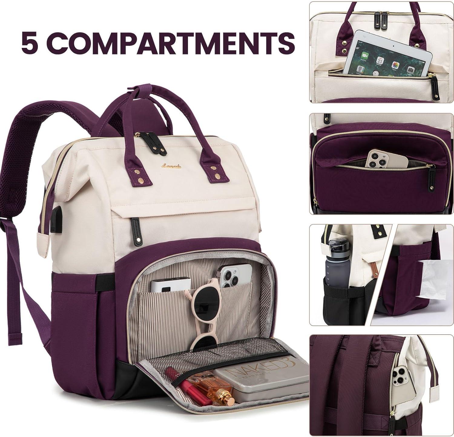 LOVEVOOK Laptop Backpack for Women, 15.6 Inch Work Business Backpacks Purse With Large Capacity, Waterproof Nurse Bag College Bookbag for School, Waterproof Casual Daypack for Travel(White-deep Purple)