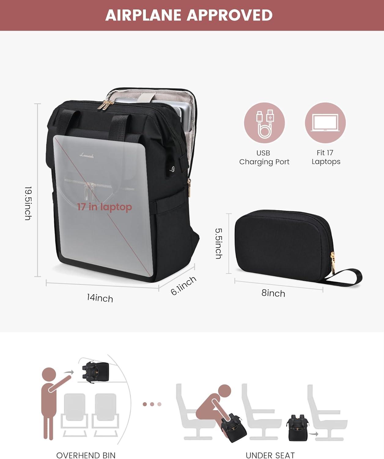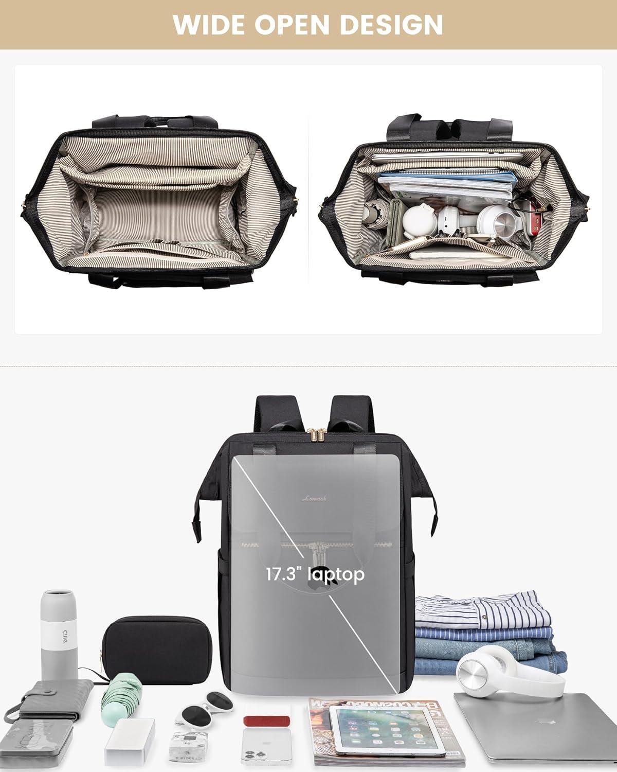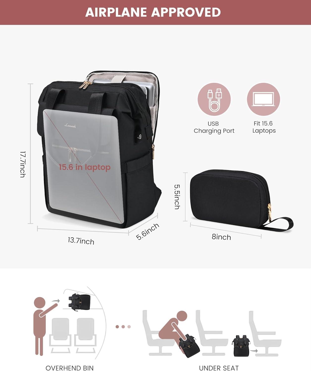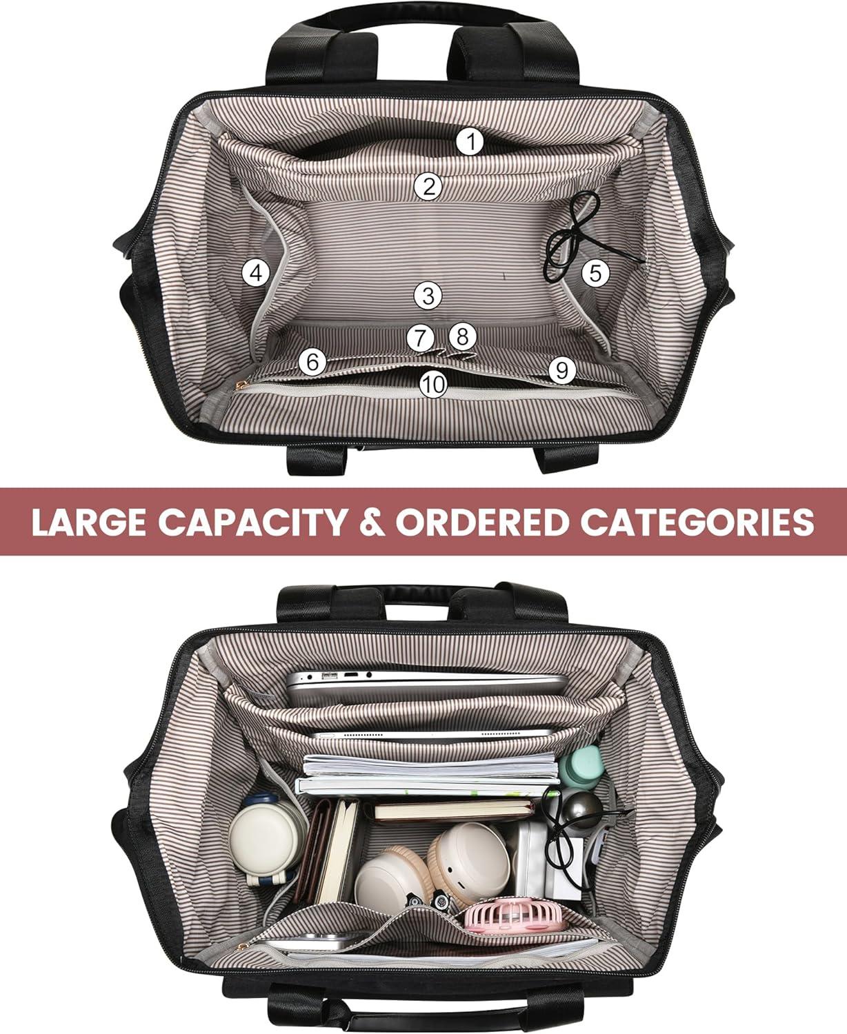 【Large Capacity Work Backpack】Size 17.7*13.7*5.6 inch. One womens backpack to solve all daily troubles. Work bag has multiple divider pockets, easy to organize all work supplies as 15.6″ laptop, 11″ ipads, Phone, binder, water bottle, umbrella and so on.