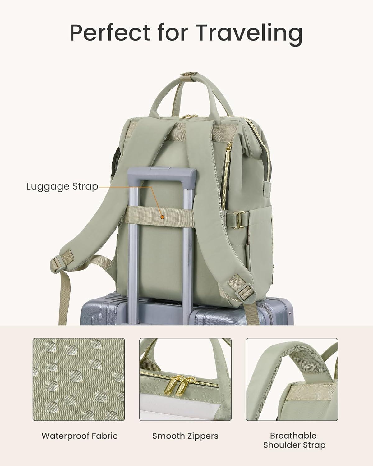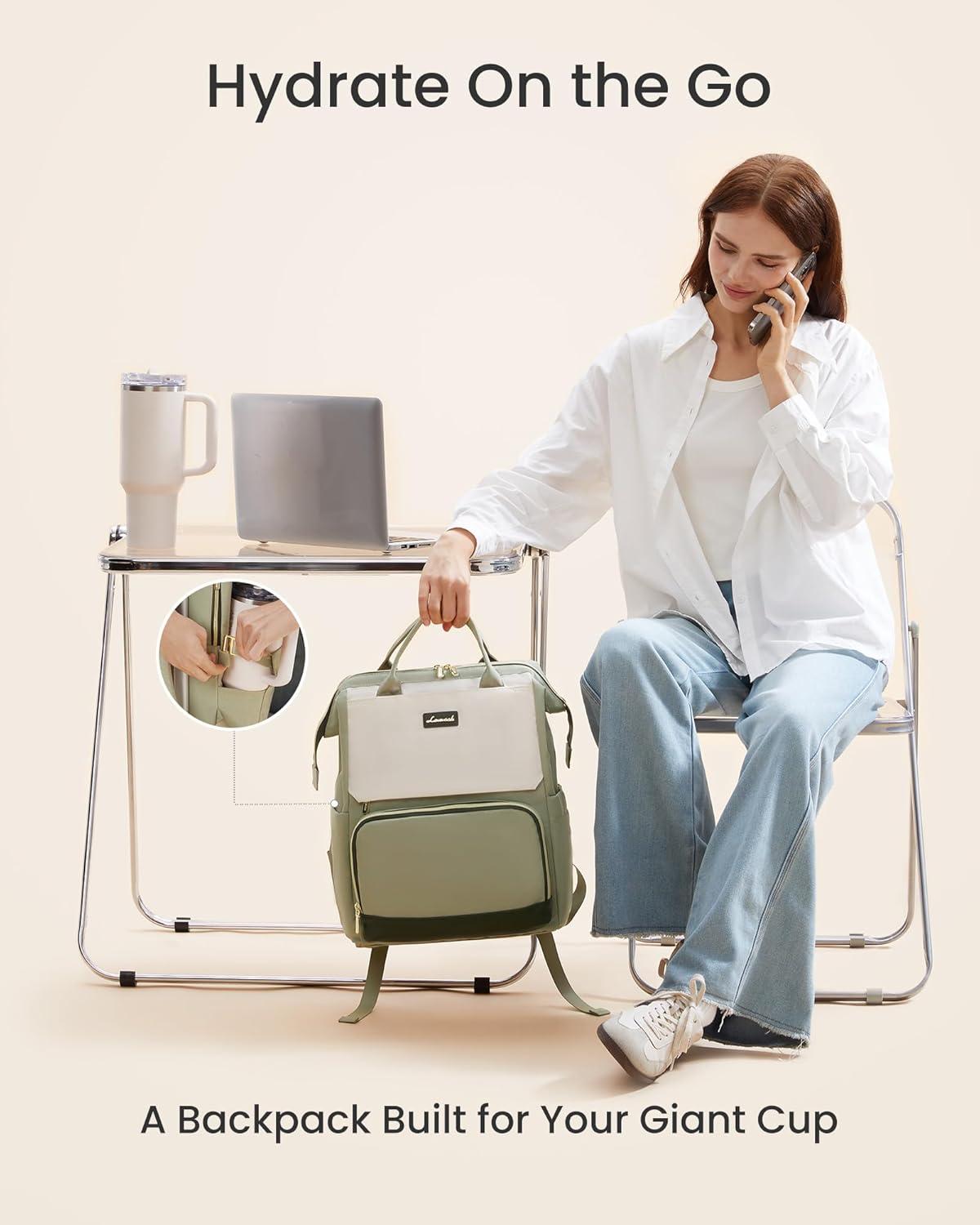 LOVEVOOK Laptop Backpack for Women with Giant Tumbler Holder Pocket, 15.6 inch Travel Work Backpack Purse for Nurse Teacher, Waterproof School Bag College Bookbag Cute Casual Daypack for Girls(Bean Green Beige)