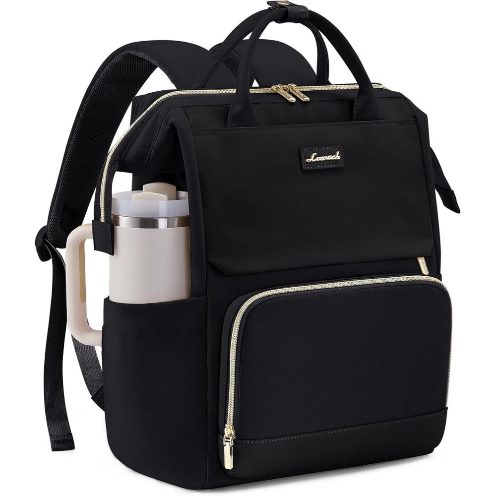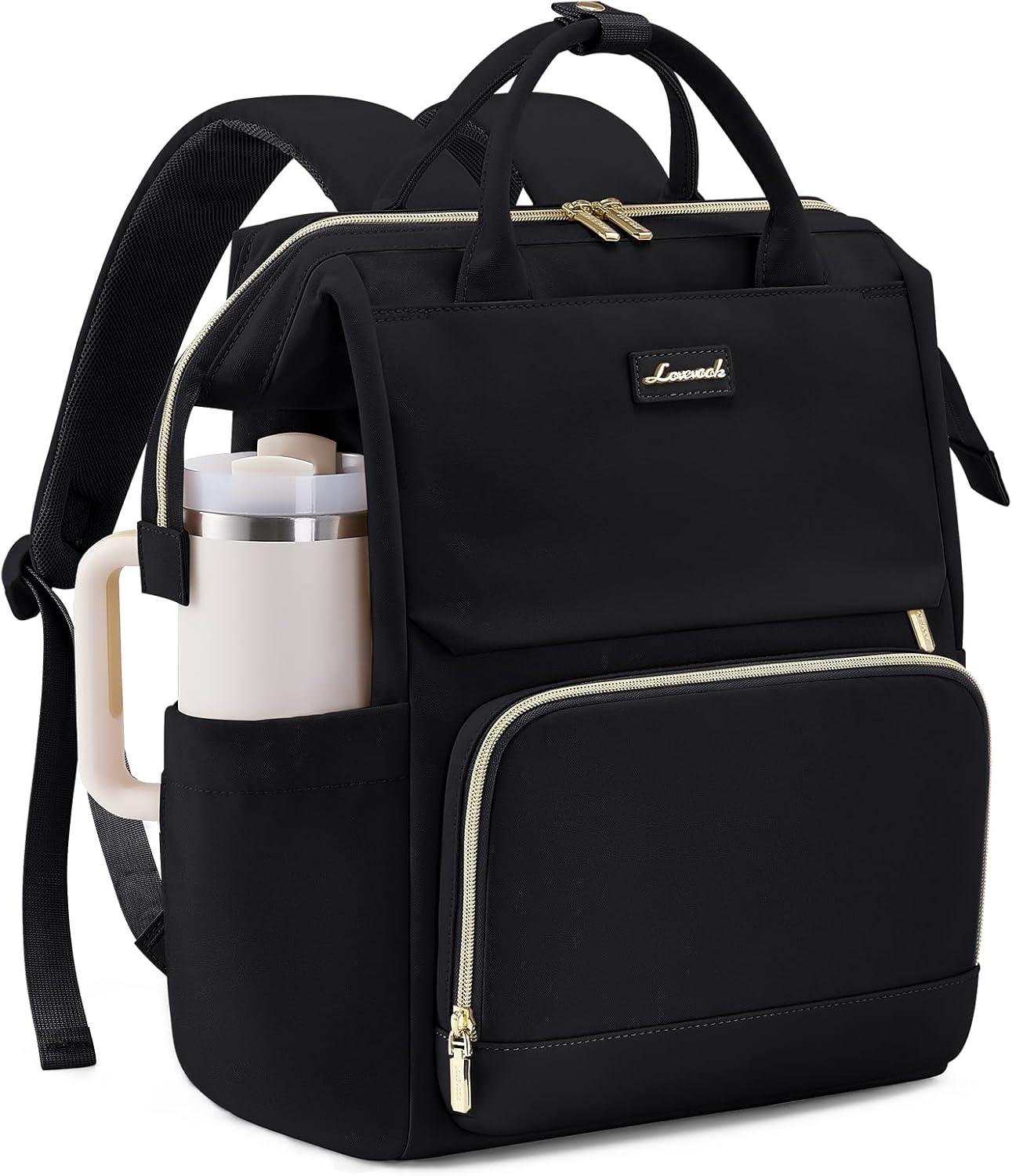 LOVEVOOK Laptop Backpack for Women with Giant Tumbler Holder Pocket, 15.6 inch Travel Work Backpack Purse for Nurse Teacher, Waterproof School Bag College Bookbag Cute Casual Daypack for Girls(Black)