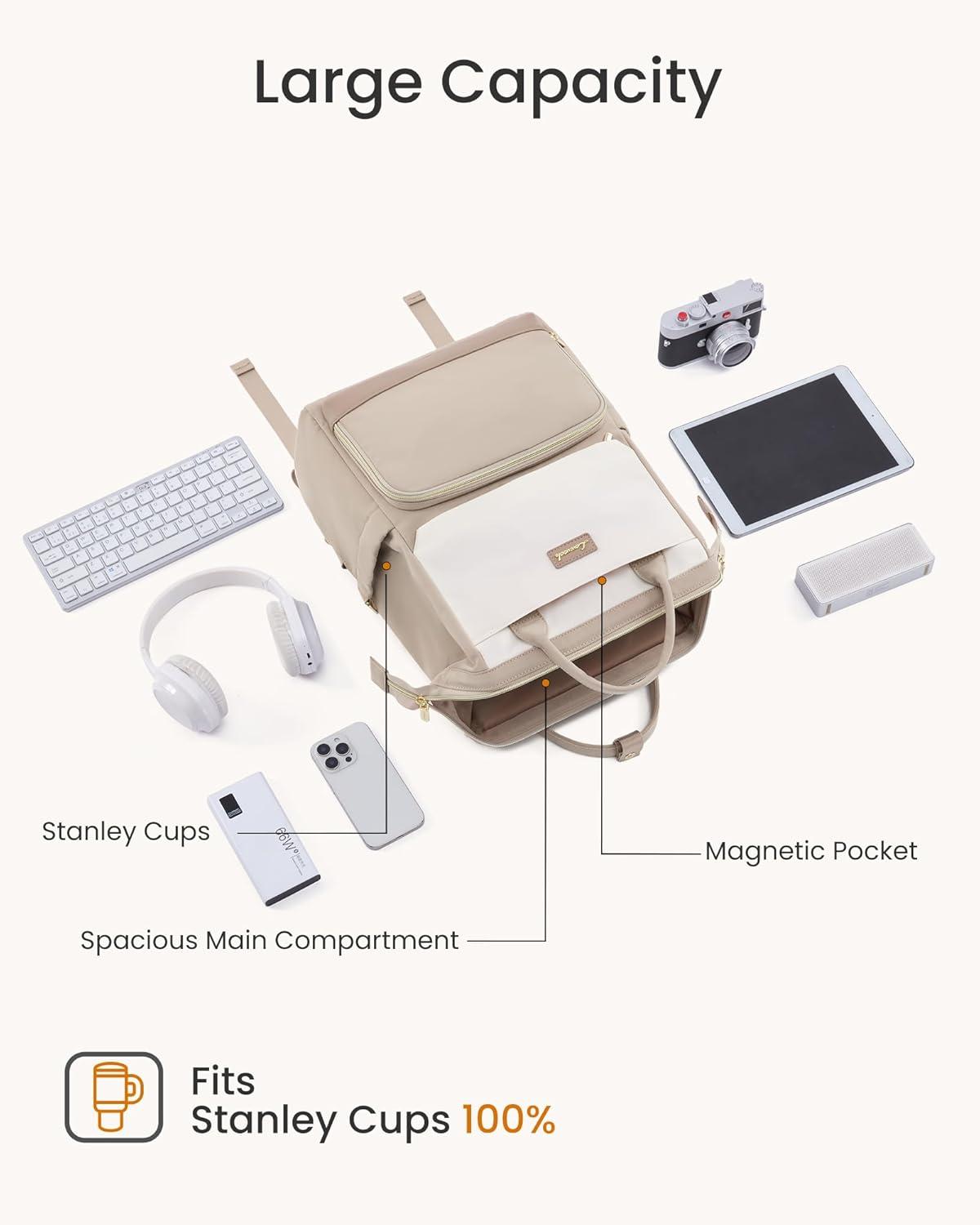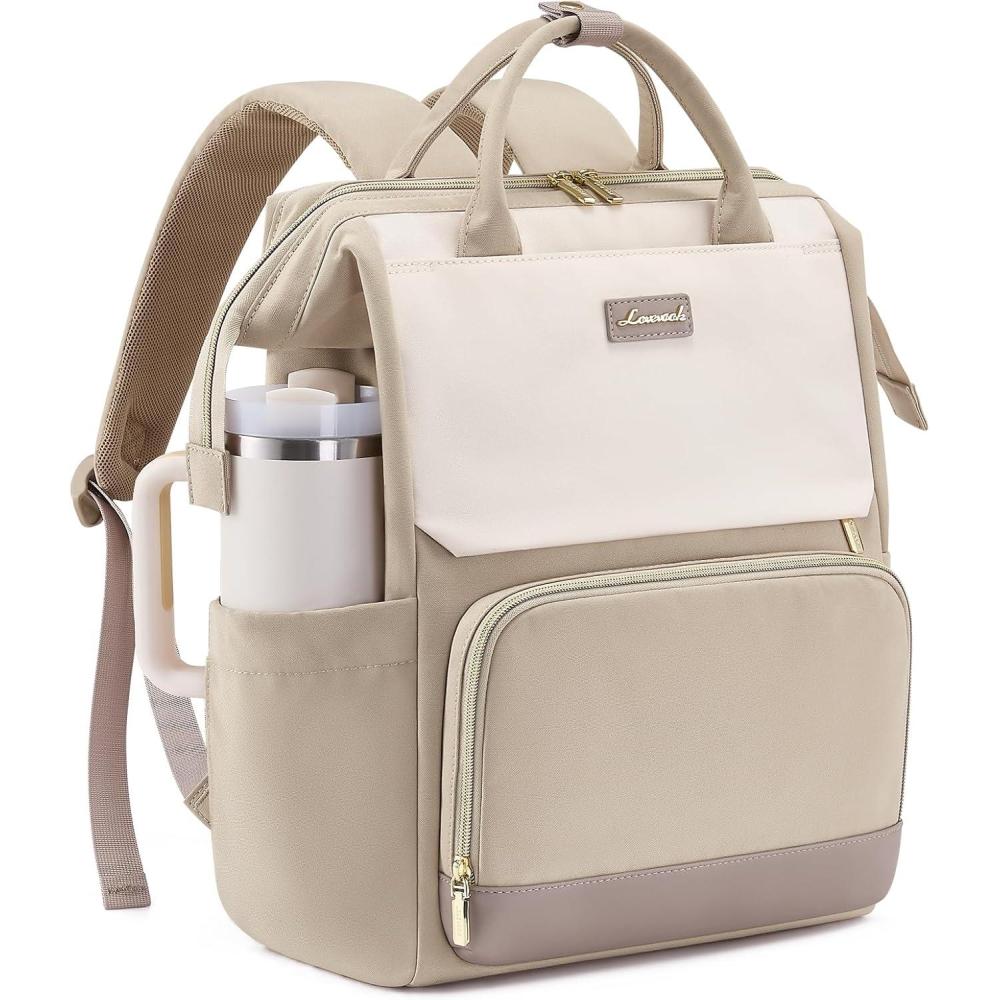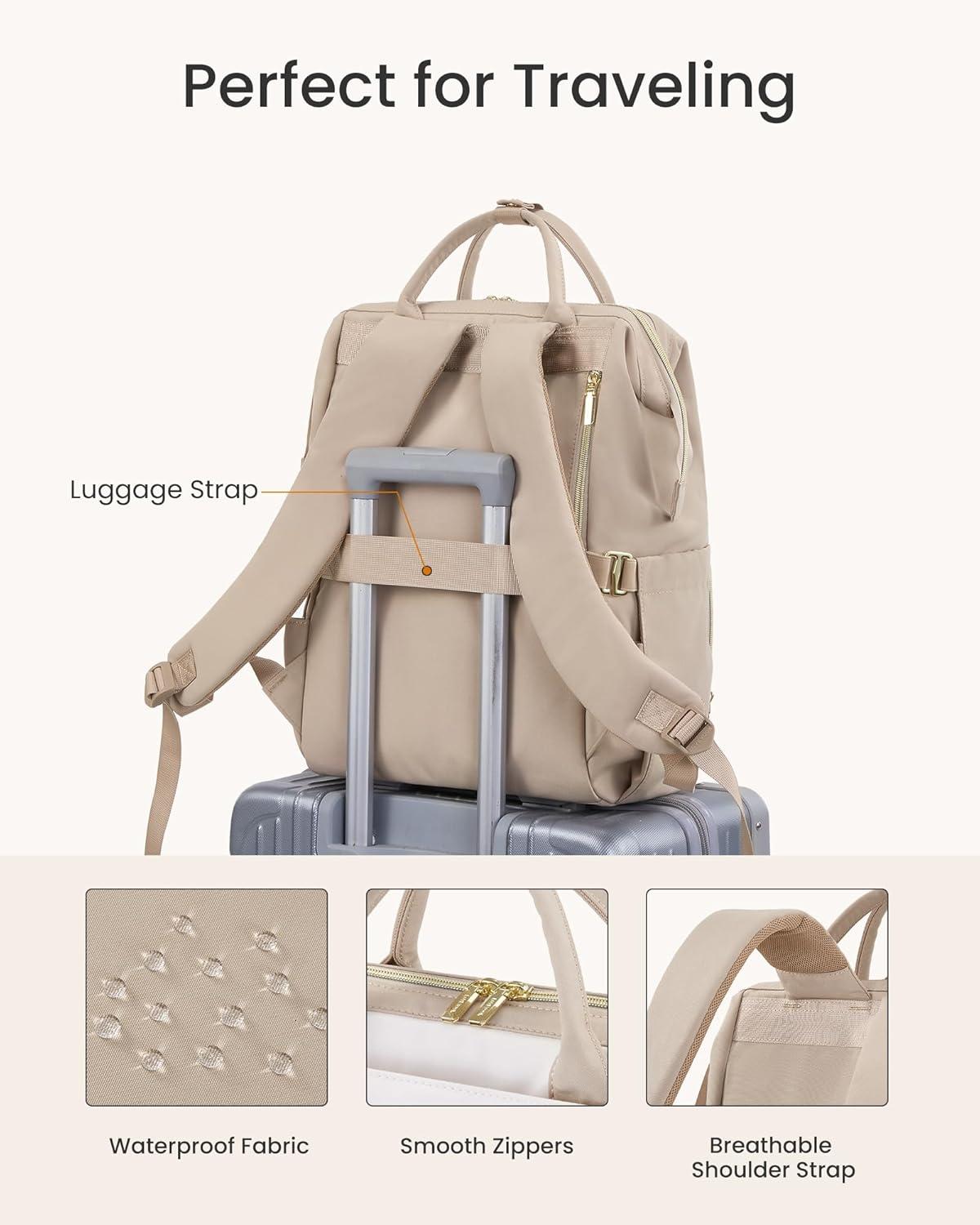 LOVEVOOK Laptop Backpack for Women with Giant Tumbler Holder Pocket, 15.6 inch Travel Work Backpack Purse for Nurse Teacher, Waterproof School Bag College Bookbag Cute Casual Daypack for Girls(Khaki Beige)