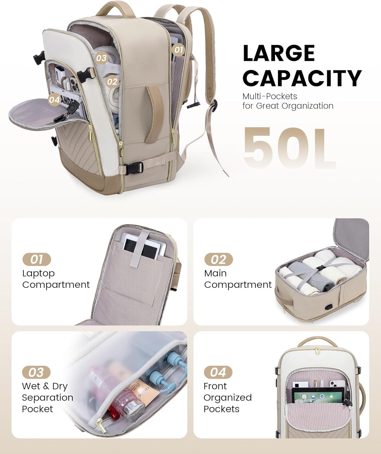 【Large Capacity & Well Organized】50L capacity, 4 main compartments, and 15 pockets, designed to allow you to easily separate and organize your travel personal items, roomy space can even fit in 3-7 days of travel essentials.