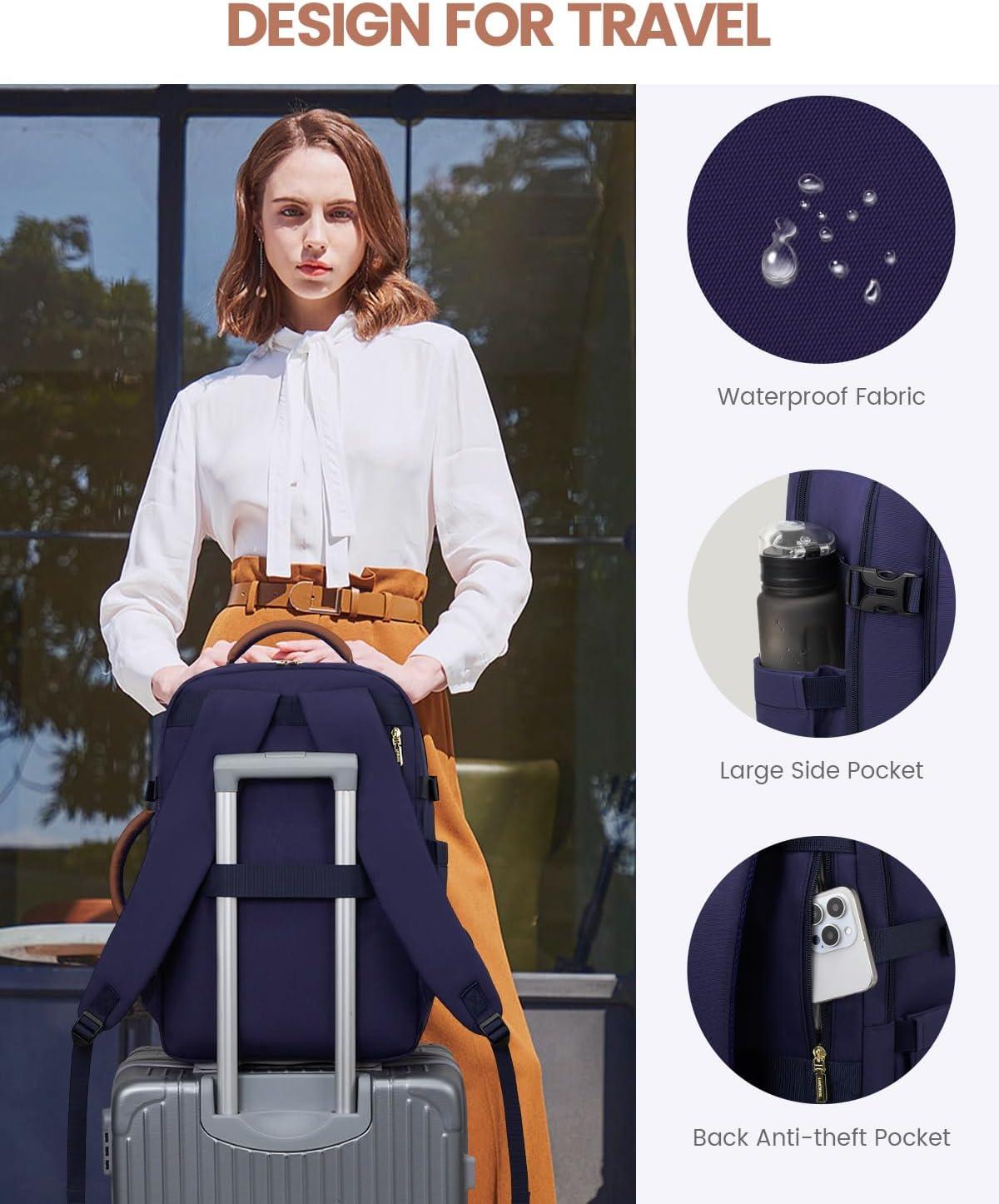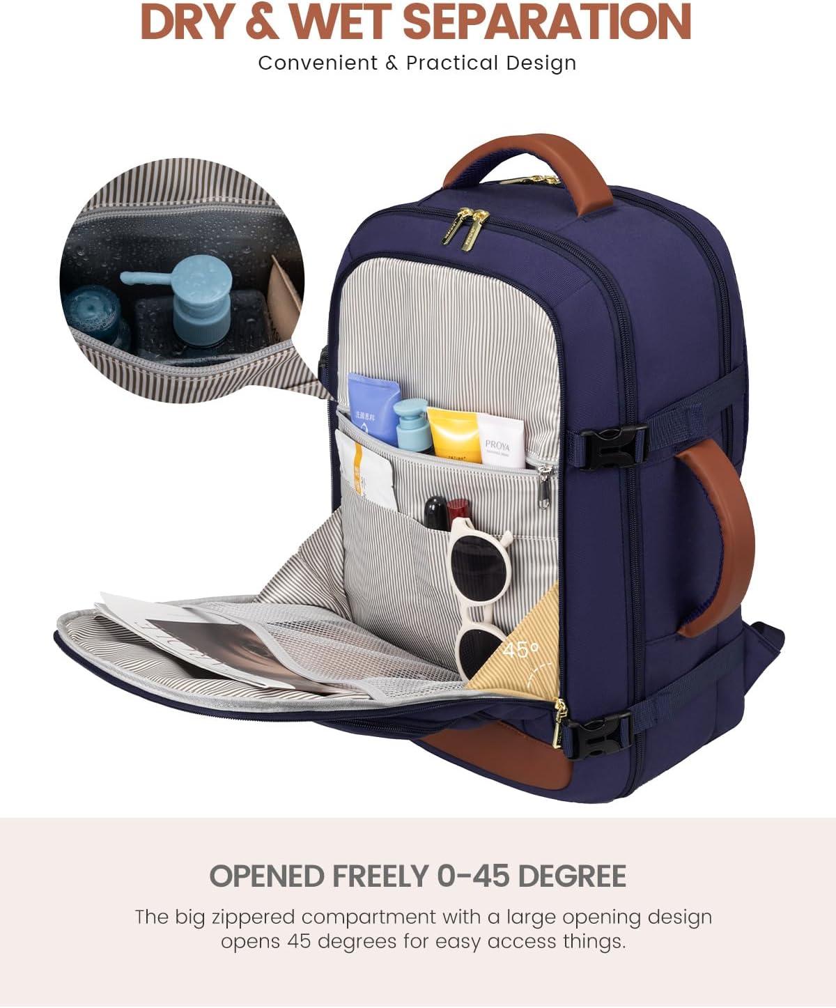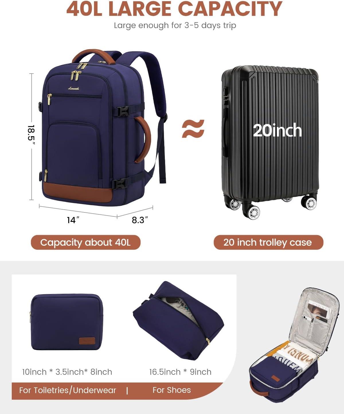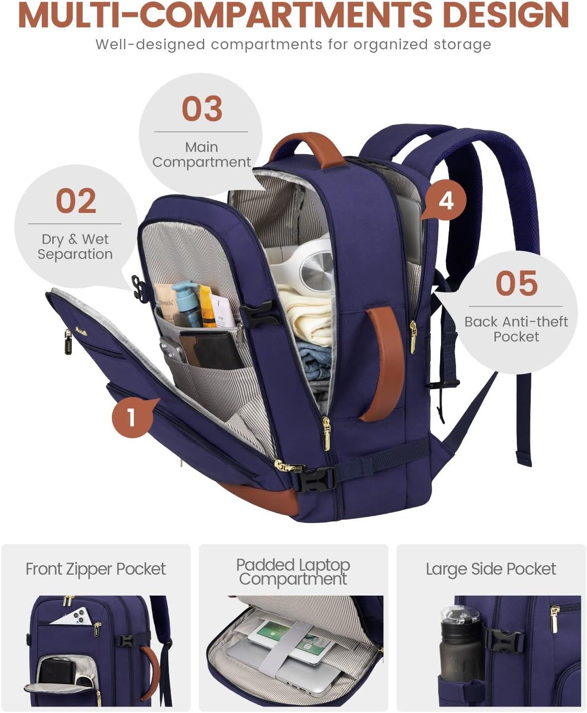 With 2 Packing Cubes & Wet Pocket : Our travel backpack for women equipped with 1 carry-on pocket, deal for neatly storing underwear, socks, and small clothes. And equipped one shoe bag with 16.5 inches/42cm long, can hold 1~2 pair of shoes. The high-density waterproof wet pocket is perfect for toiletries and damp clothes, keeping your travel belongings tidy and separated.