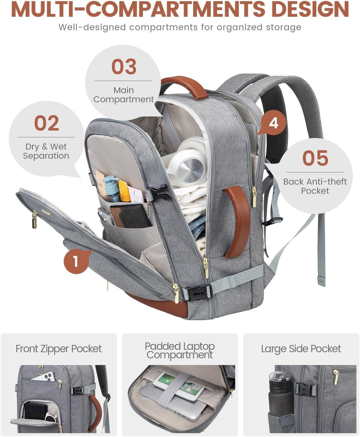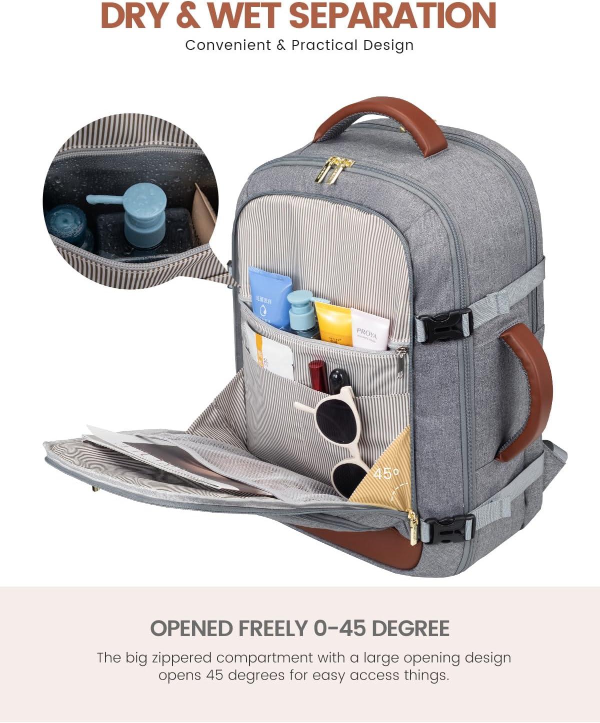 With 2 Packing Cubes & Wet Pocket : Our travel backpack for women equipped with 1 carry-on pocket, deal for neatly storing underwear, socks, and small clothes. And equipped one shoe bag with 16.5 inches/42cm long, can hold 1~2 pair of shoes. The high-density waterproof wet pocket is perfect for toiletries and damp clothes, keeping your travel belongings tidy and separated.