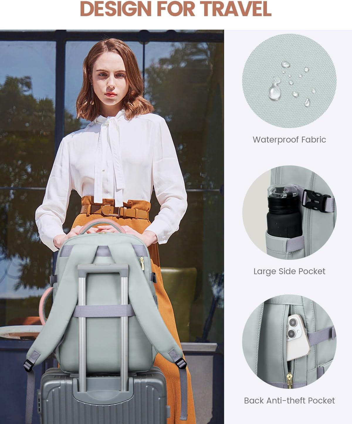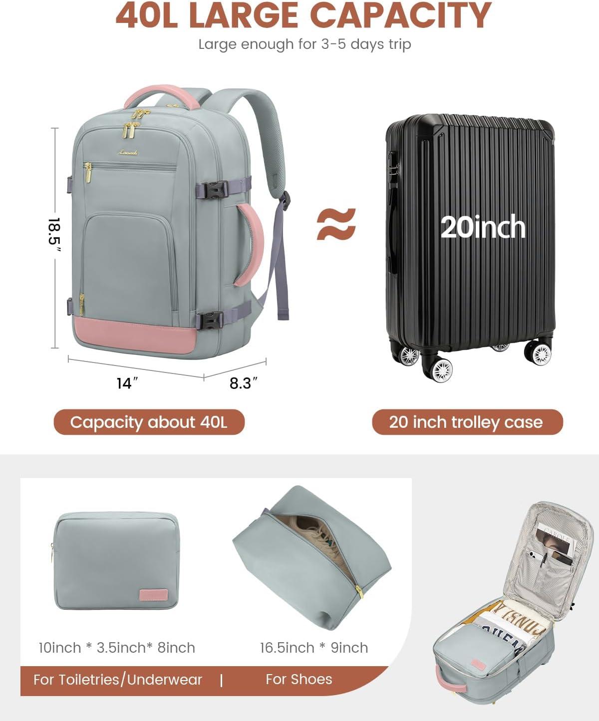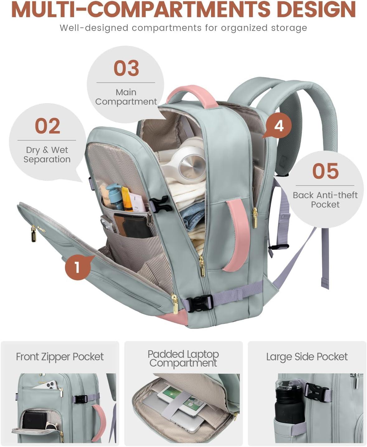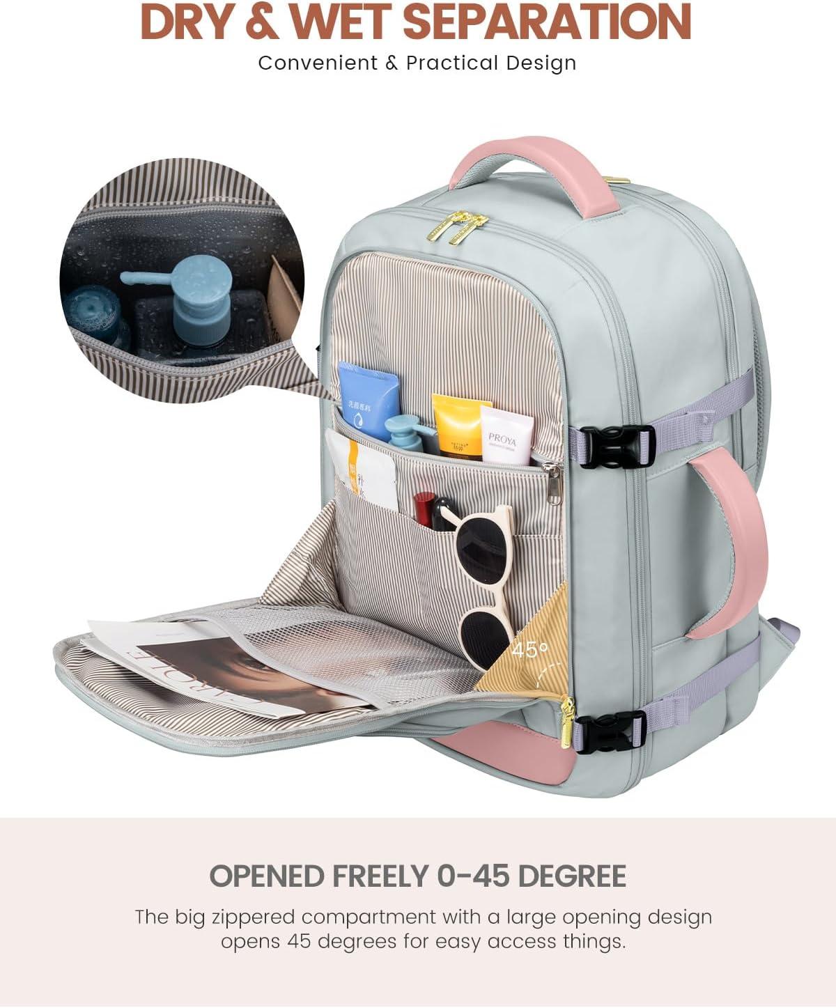 With 2 Packing Cubes & Wet Pocket : Our travel backpack for women equipped with 1 carry-on pocket, deal for neatly storing underwear, socks, and small clothes. And equipped one shoe bag with 16.5 inches/42cm long, can hold 1~2 pair of shoes. The high-density waterproof wet pocket is perfect for toiletries and damp clothes, keeping your travel belongings tidy and separated.