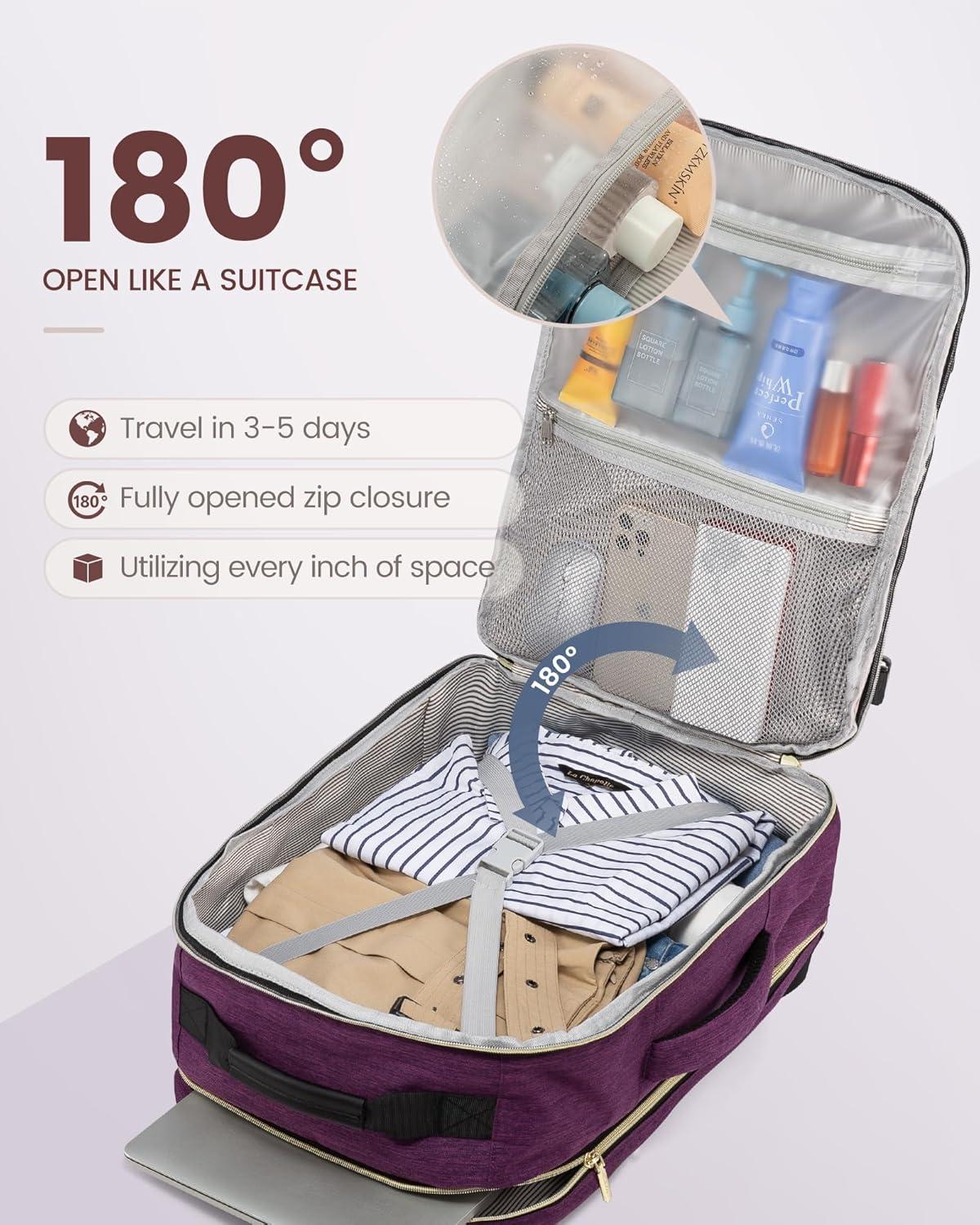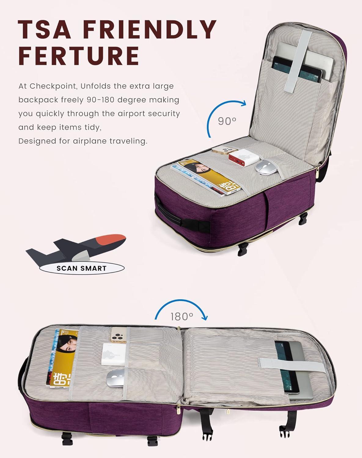 ✈【As Personal Item Airline Approved:】 The size of the carry on backpack is 18*14*8inch. Meets the maximum size allowed by most International Air Transport Association (IATA) flights, and can be placed in the overhead luggage compartment and under seat luggage for airlines, suitable for Spirit, Frontier, Easy Jet, Jet Blue, and other airlines. This travel backpack for women airline approved can be freely opened 90-180 degrees easily and quickly at the airport security check.