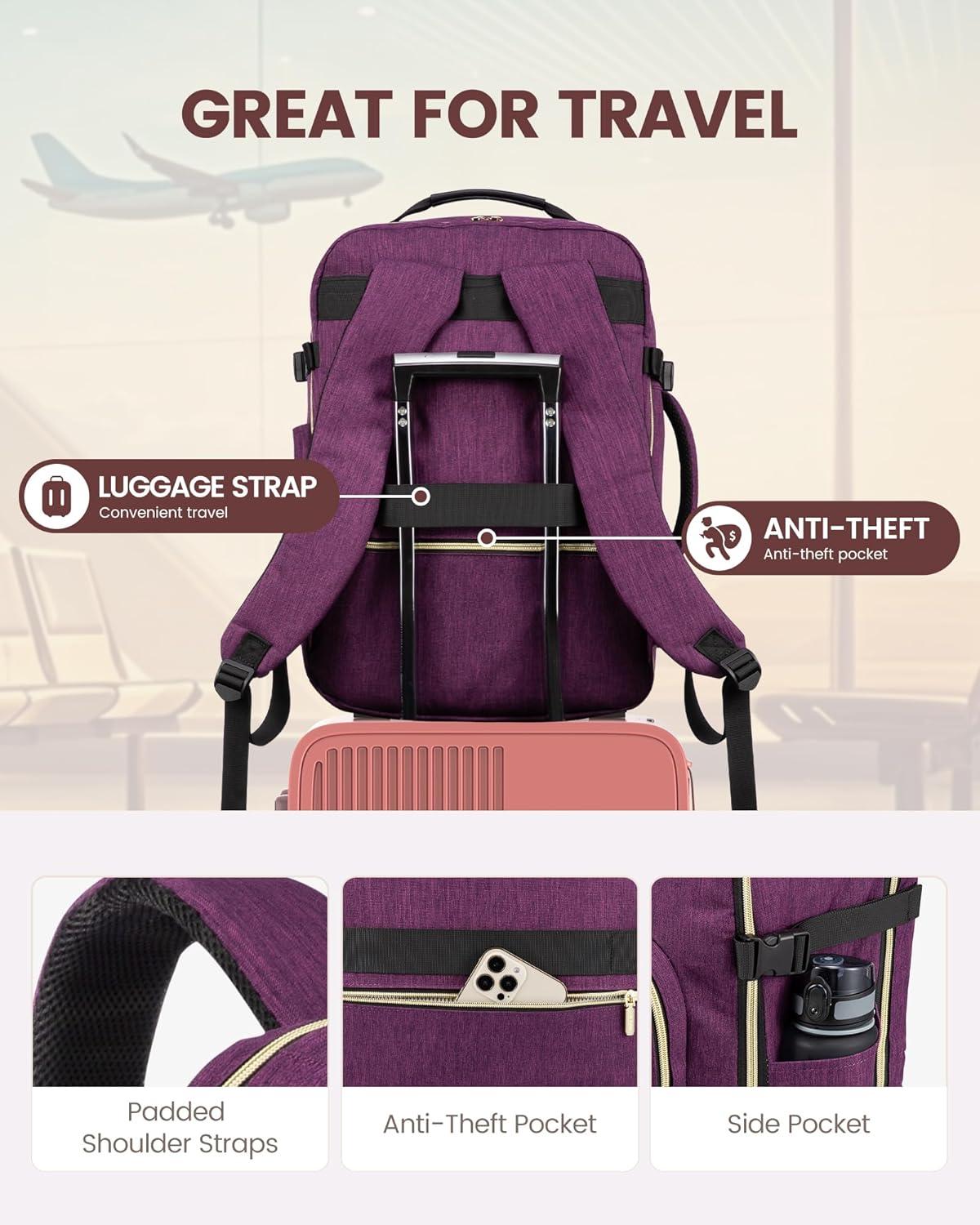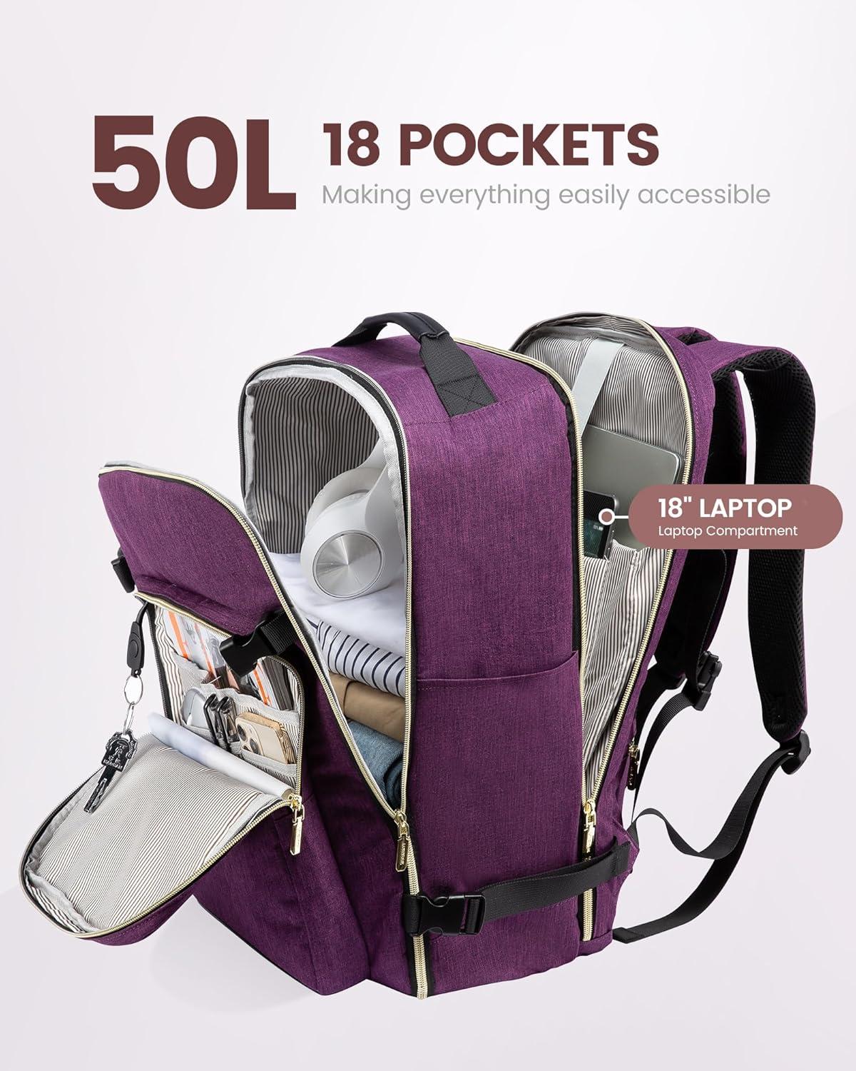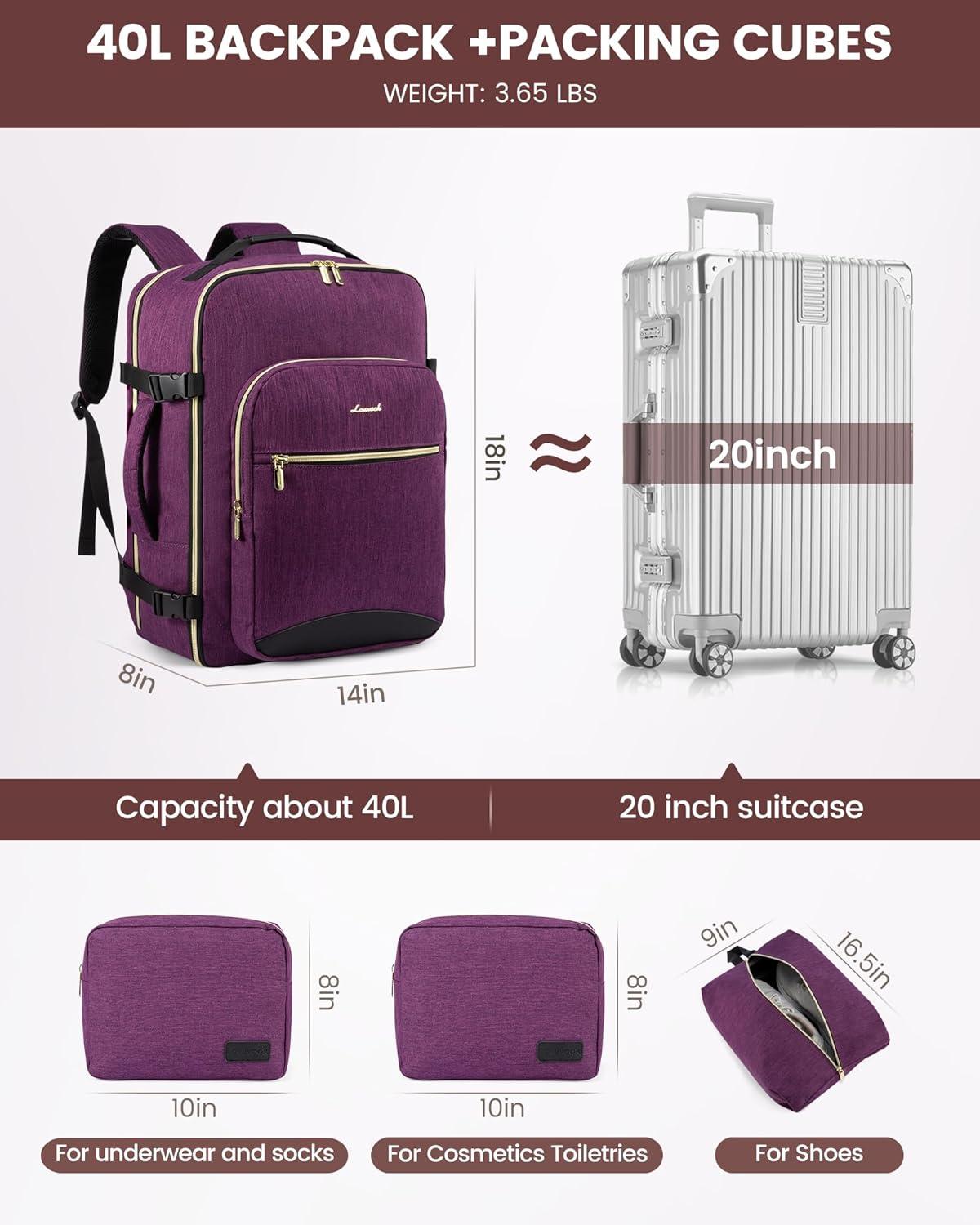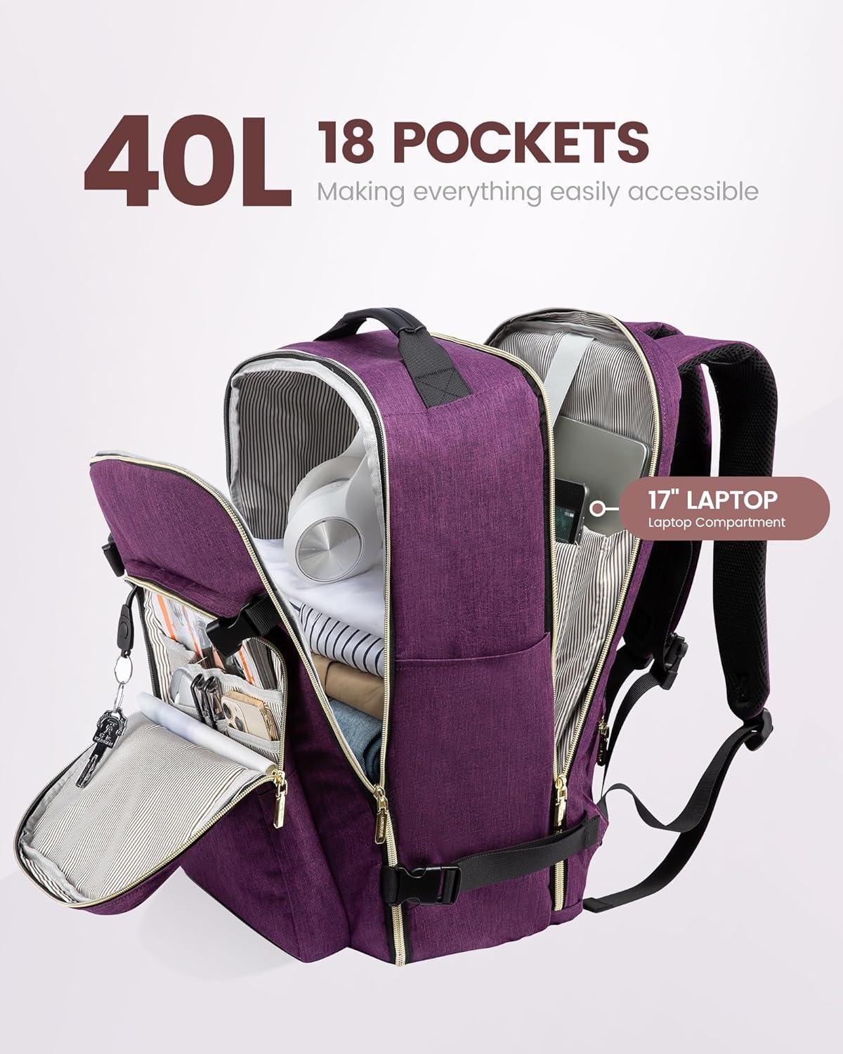 ✈【Large Capacity & Multiple Pockets】: The travel backpack has a 40L large capacity and 4 main compartments, which can meet daily and travel needs. The travel backpack for women's main compartment can store a lot of things, including 5-8 pieces of clothing, shoes, books, and many other items. The separate laptop compartment is padded with EVA foam to provide the best protection for your 17″ laptop and 12.9″ iPad. The front compartment has many pockets to keep your belongings organized.