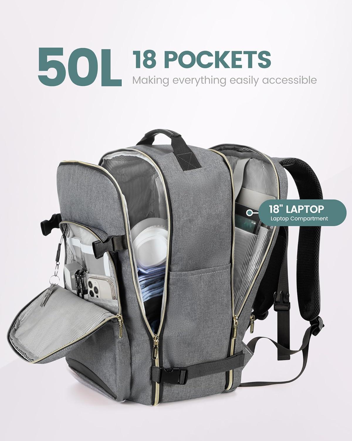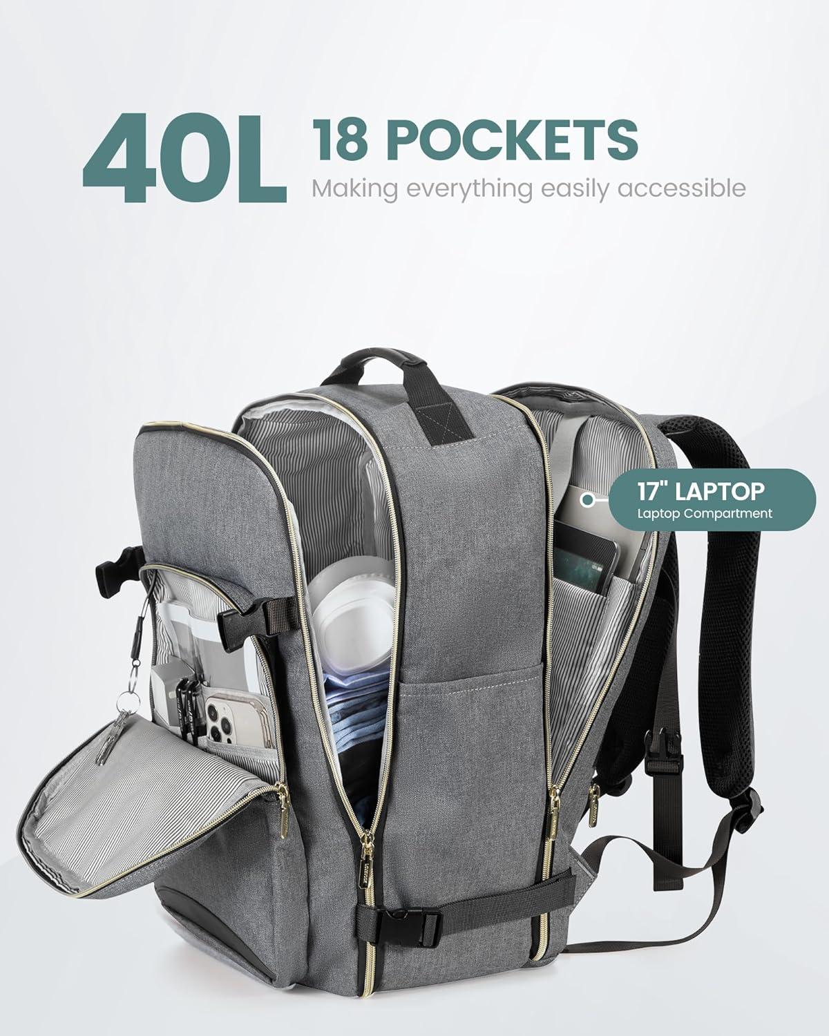 ✈【Large Capacity & Multiple Pockets】: The travel backpack has a 40L large capacity and 4 main compartments, which can meet daily and travel needs. The travel backpack for women's main compartment can store a lot of things, including 5-8 pieces of clothing, shoes, books, and many other items. The separate laptop compartment is padded with EVA foam to provide the best protection for your 17″ laptop and 12.9″ iPad. The front compartment has many pockets to keep your belongings organized.