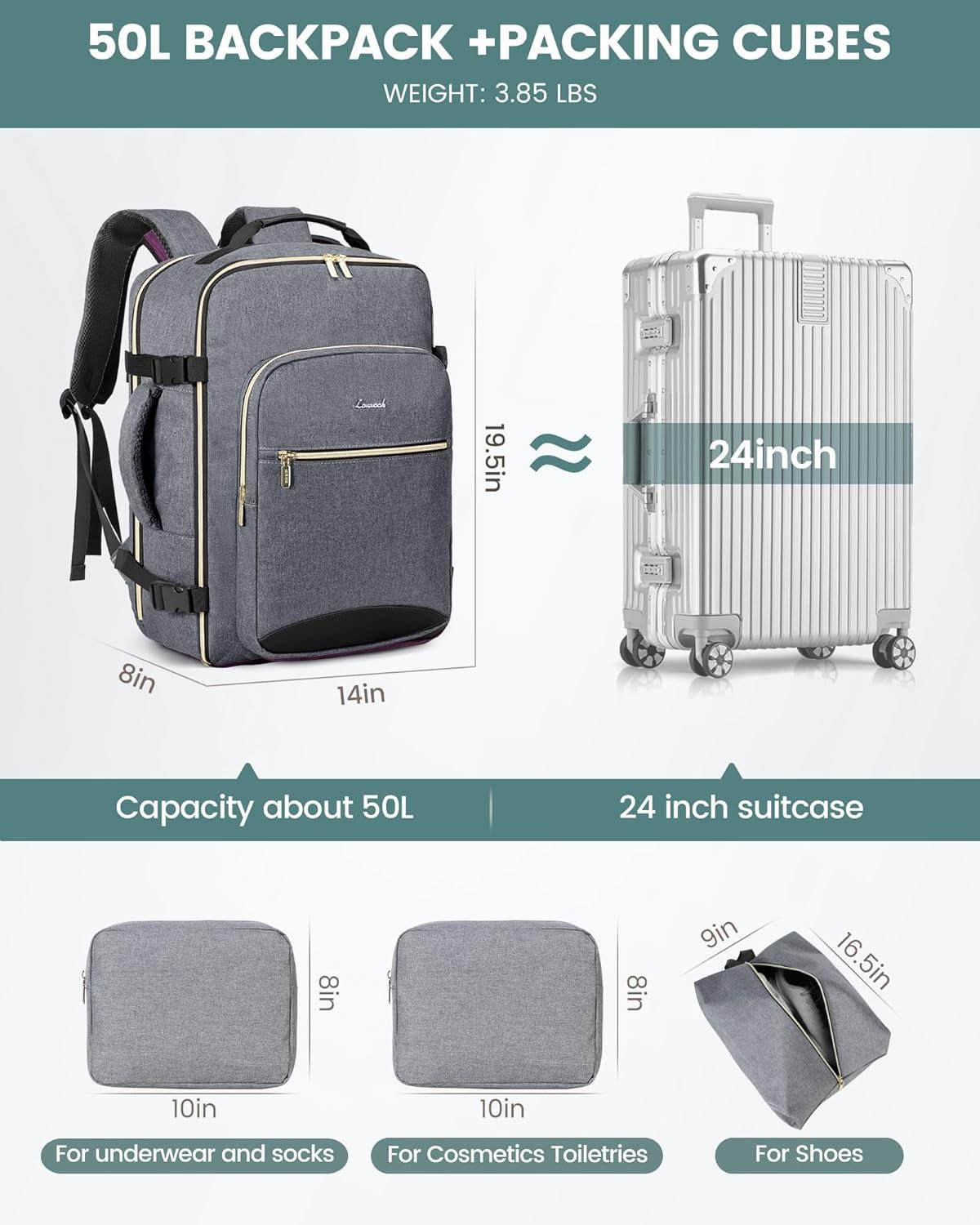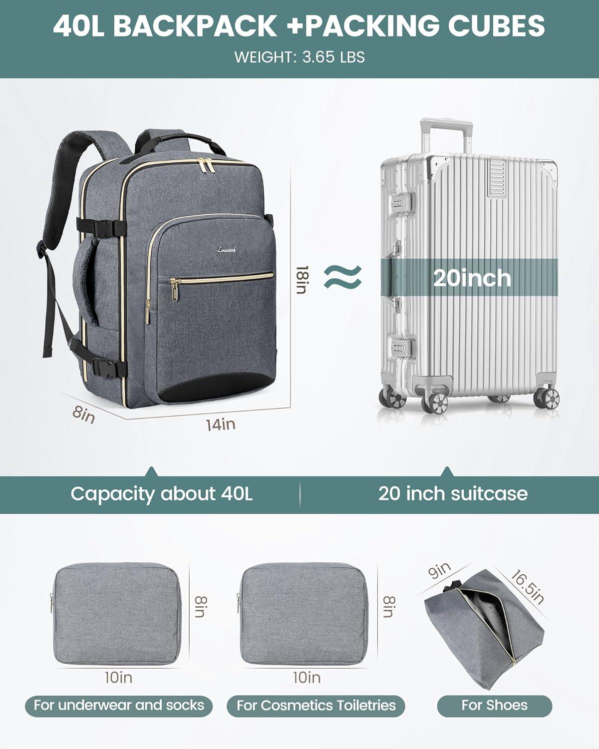 imageLOVEVOOK Travel Backpack for Women ampamp Men 40LAirline Approved Carry On Backpack Travel EssentialsTSA Carry on LuggageWaterproof Personal Item Travel BagSuitcase with 3 Packing CubesLight grayPinkDark Purpleblack1