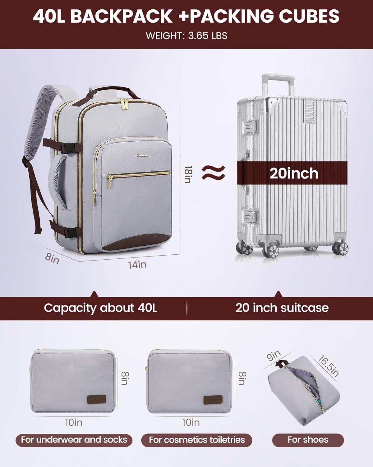 imageLOVEVOOK Travel Backpack for Women ampamp Men 40LAirline Approved Carry On Backpack Travel EssentialsTSA Carry on LuggageWaterproof Personal Item Travel BagSuitcase with 3 Packing CubesLight grayPinkGreybrown