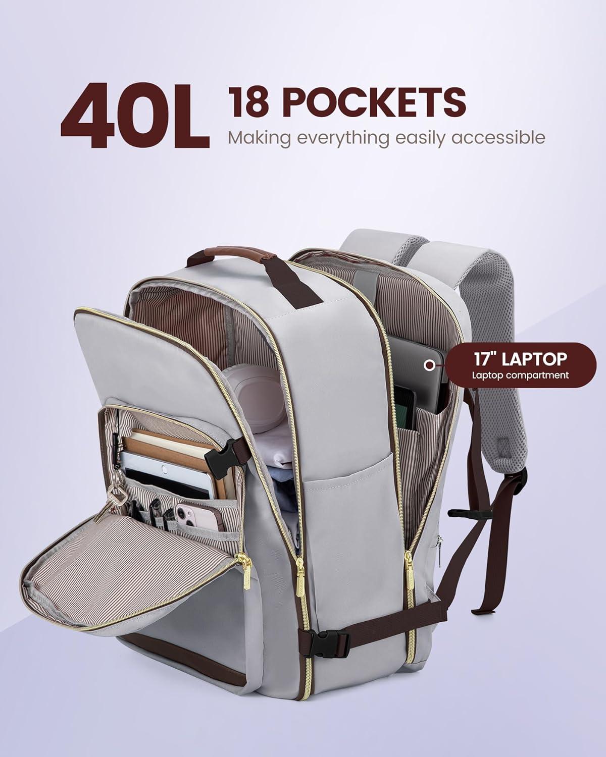 ✈【Large Capacity & Multiple Pockets】: The travel backpack has a 40L large capacity and 4 main compartments, which can meet daily and travel needs. The travel backpack for women's main compartment can store a lot of things, including 5-8 pieces of clothing, shoes, books, and many other items. The separate laptop compartment is padded with EVA foam to provide the best protection for your 17″ laptop and 12.9″ iPad. The front compartment has many pockets to keep your belongings organized.
