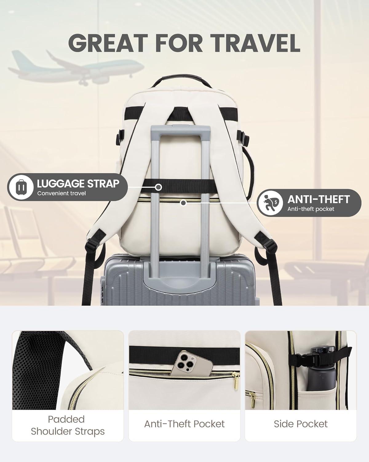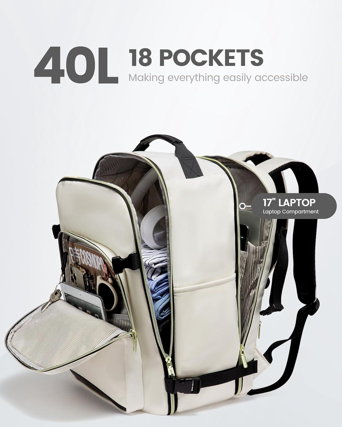 ✈【Large Capacity & Multiple Pockets】: The travel backpack has a 40L large capacity and 4 main compartments, which can meet daily and travel needs. The travel backpack for women's main compartment can store a lot of things, including 5-8 pieces of clothing, shoes, books, and many other items. The separate laptop compartment is padded with EVA foam to provide the best protection for your 17″ laptop and 12.9″ iPad. The front compartment has many pockets to keep your belongings organized.