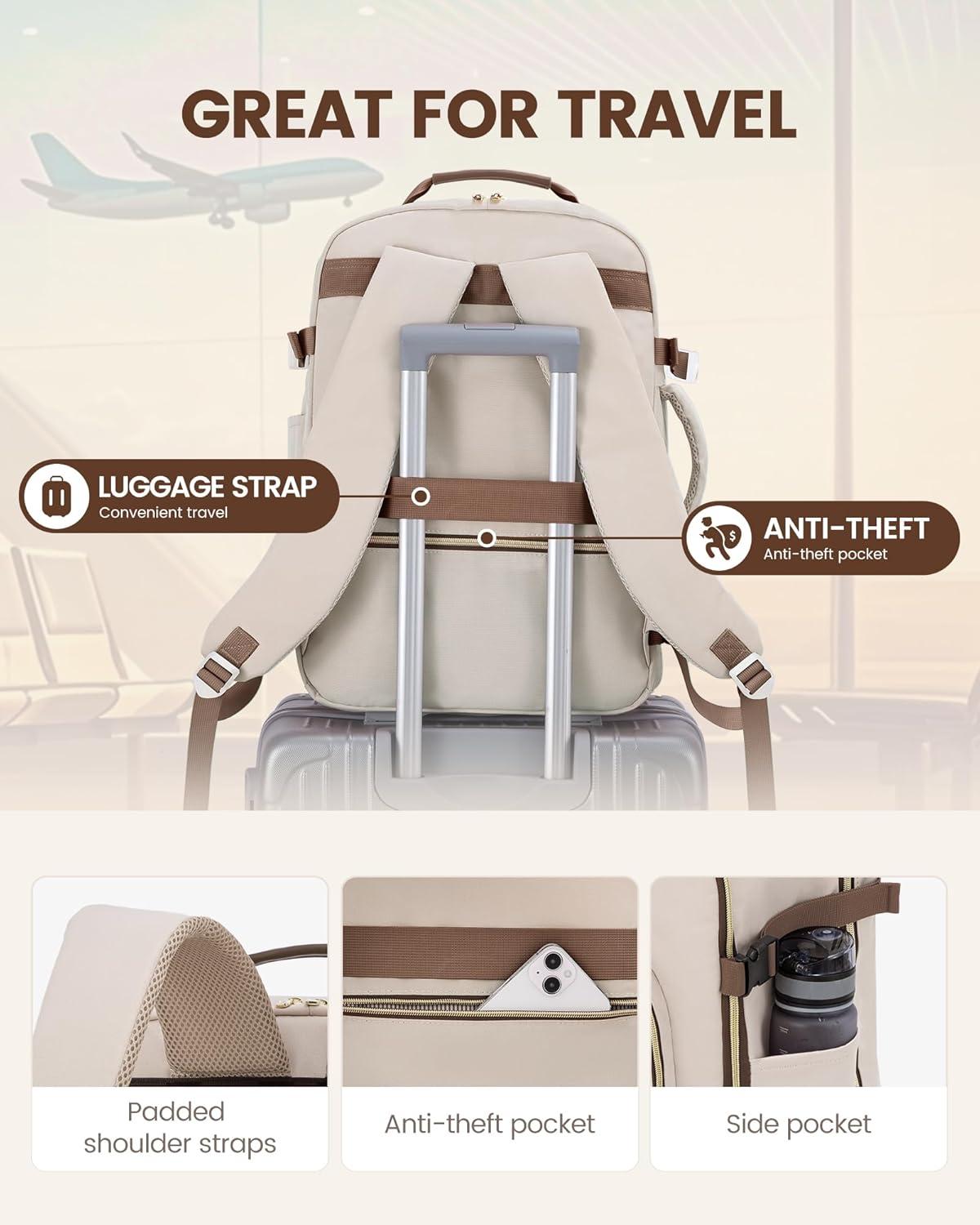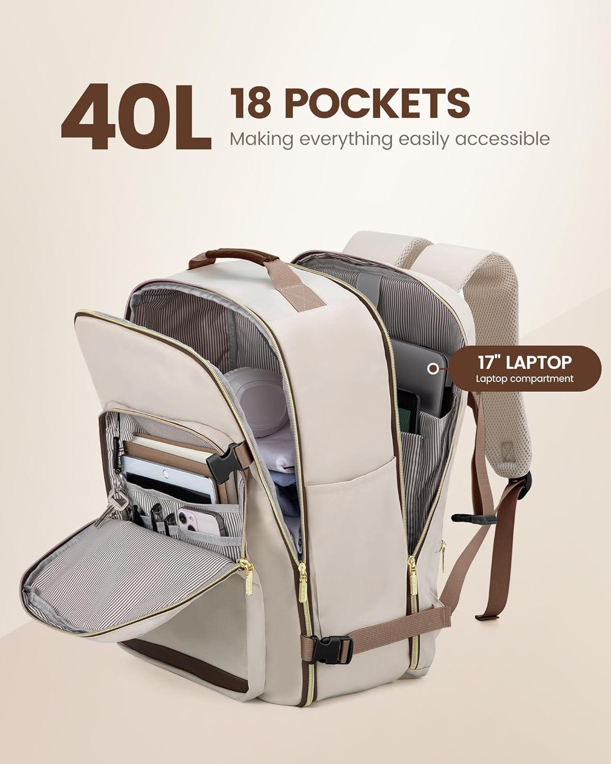 ✈【Large Capacity & Multiple Pockets】: The travel backpack has a 40L large capacity and 4 main compartments, which can meet daily and travel needs. The travel backpack for women's main compartment can store a lot of things, including 5-8 pieces of clothing, shoes, books, and many other items. The separate laptop compartment is padded with EVA foam to provide the best protection for your 17″ laptop and 12.9″ iPad. The front compartment has many pockets to keep your belongings organized.