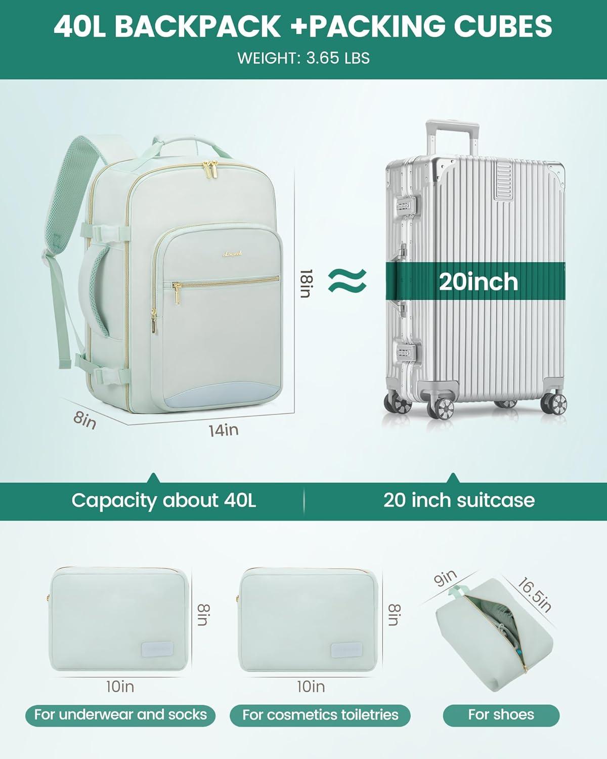 imageLOVEVOOK Travel Backpack for Women ampamp Men 40LAirline Approved Carry On Backpack Travel EssentialsTSA Carry on LuggageWaterproof Personal Item Travel BagSuitcase with 3 Packing CubesLight grayPinkTurquoiseturquoise
