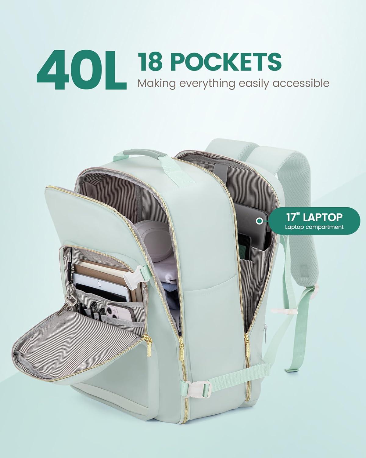 ✈【Large Capacity & Multiple Pockets】: The travel backpack has a 40L large capacity and 4 main compartments, which can meet daily and travel needs. The travel backpack for women's main compartment can store a lot of things, including 5-8 pieces of clothing, shoes, books, and many other items. The separate laptop compartment is padded with EVA foam to provide the best protection for your 17″ laptop and 12.9″ iPad. The front compartment has many pockets to keep your belongings organized.
