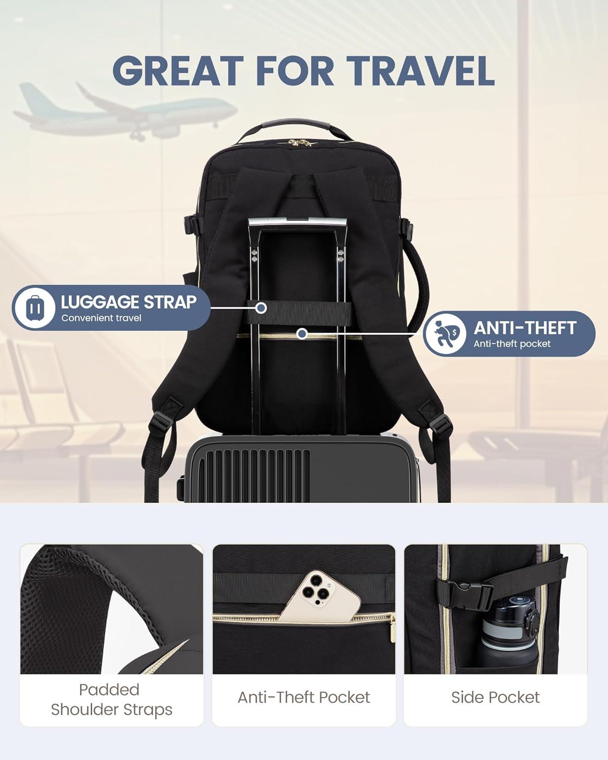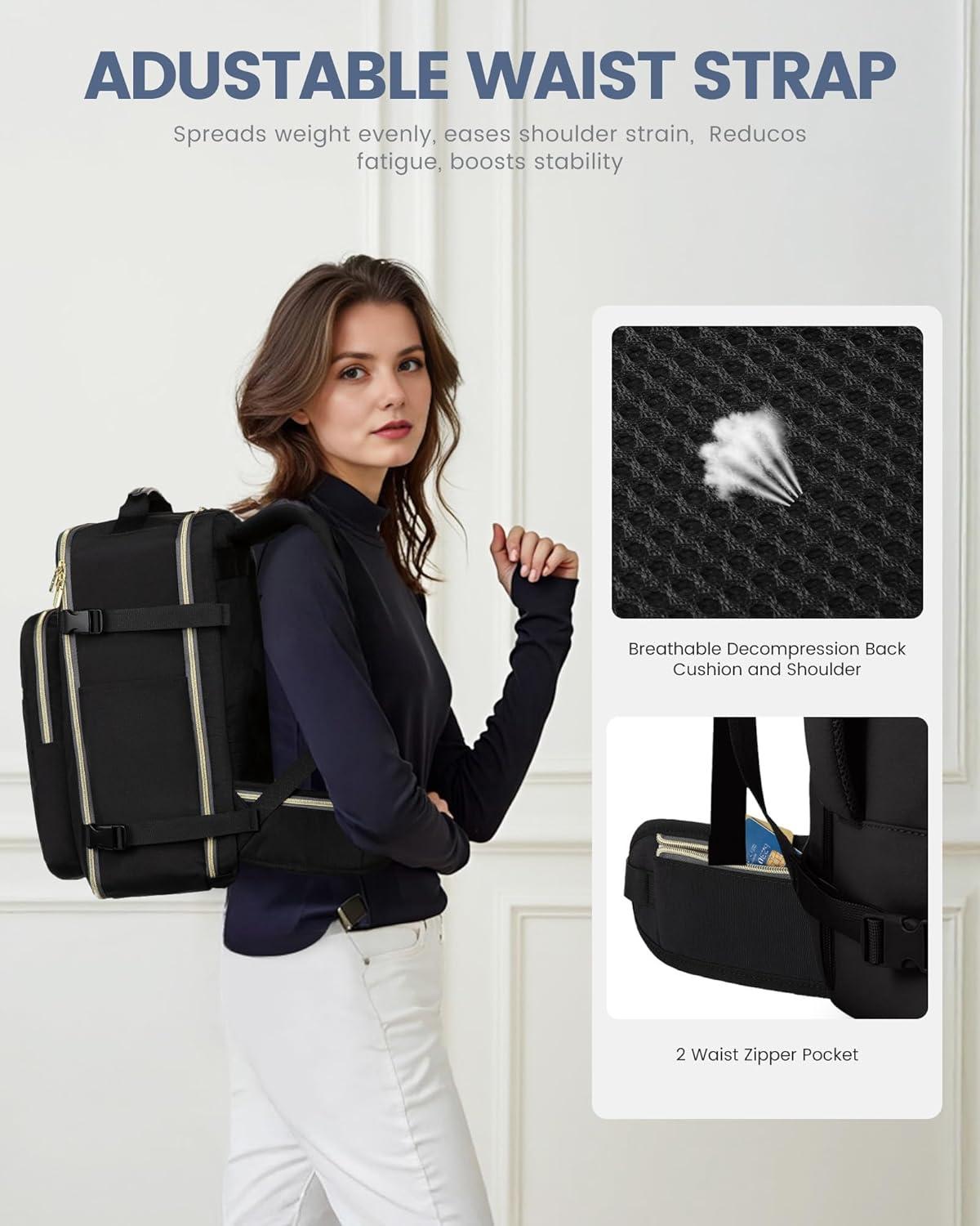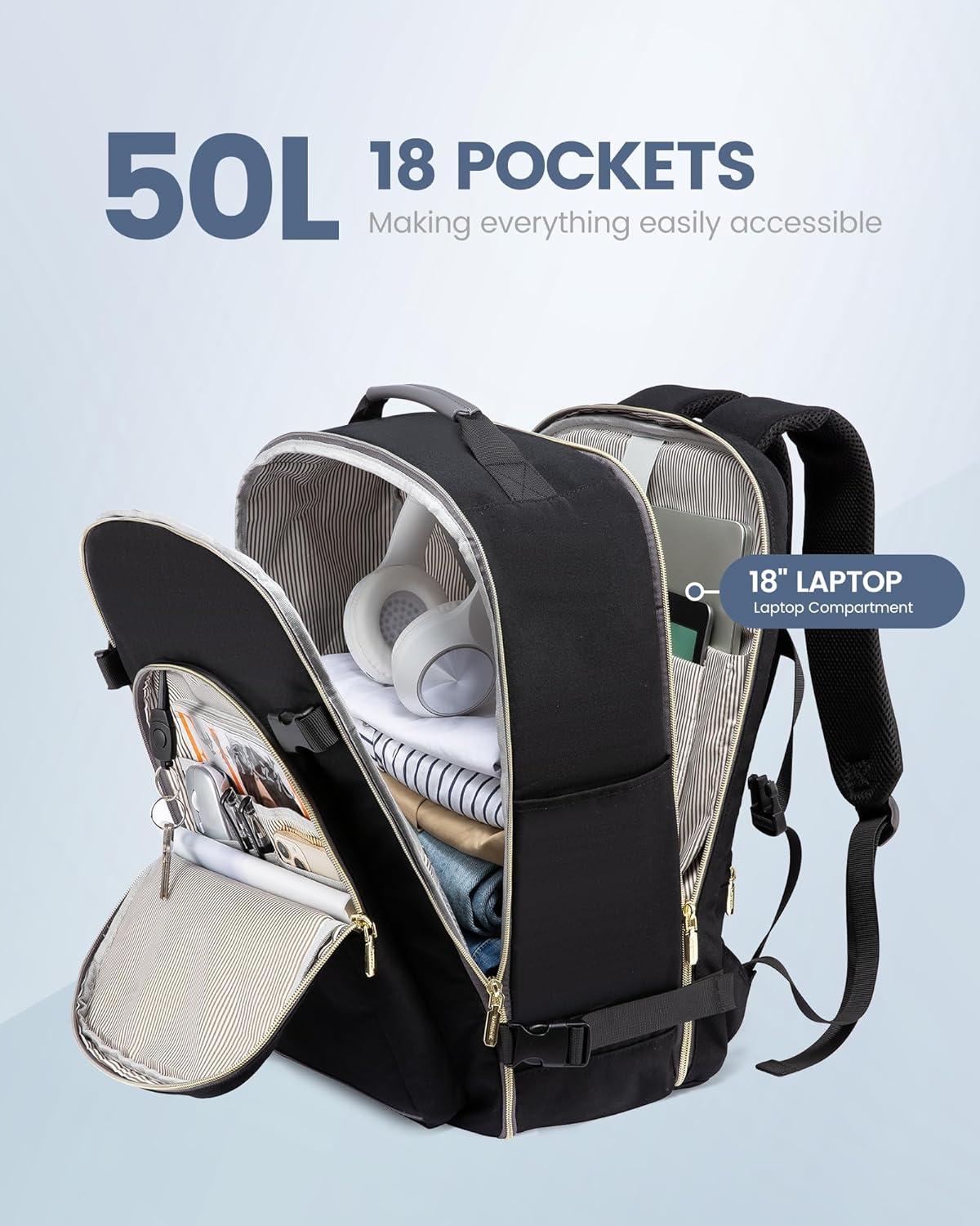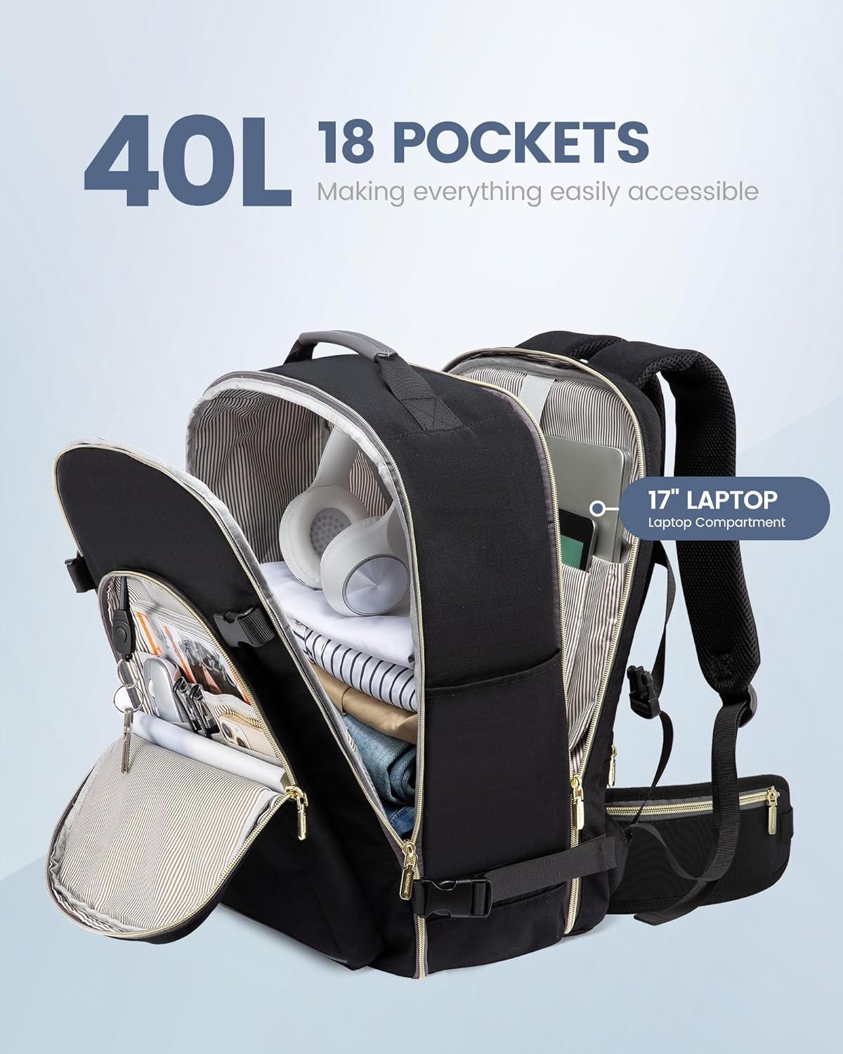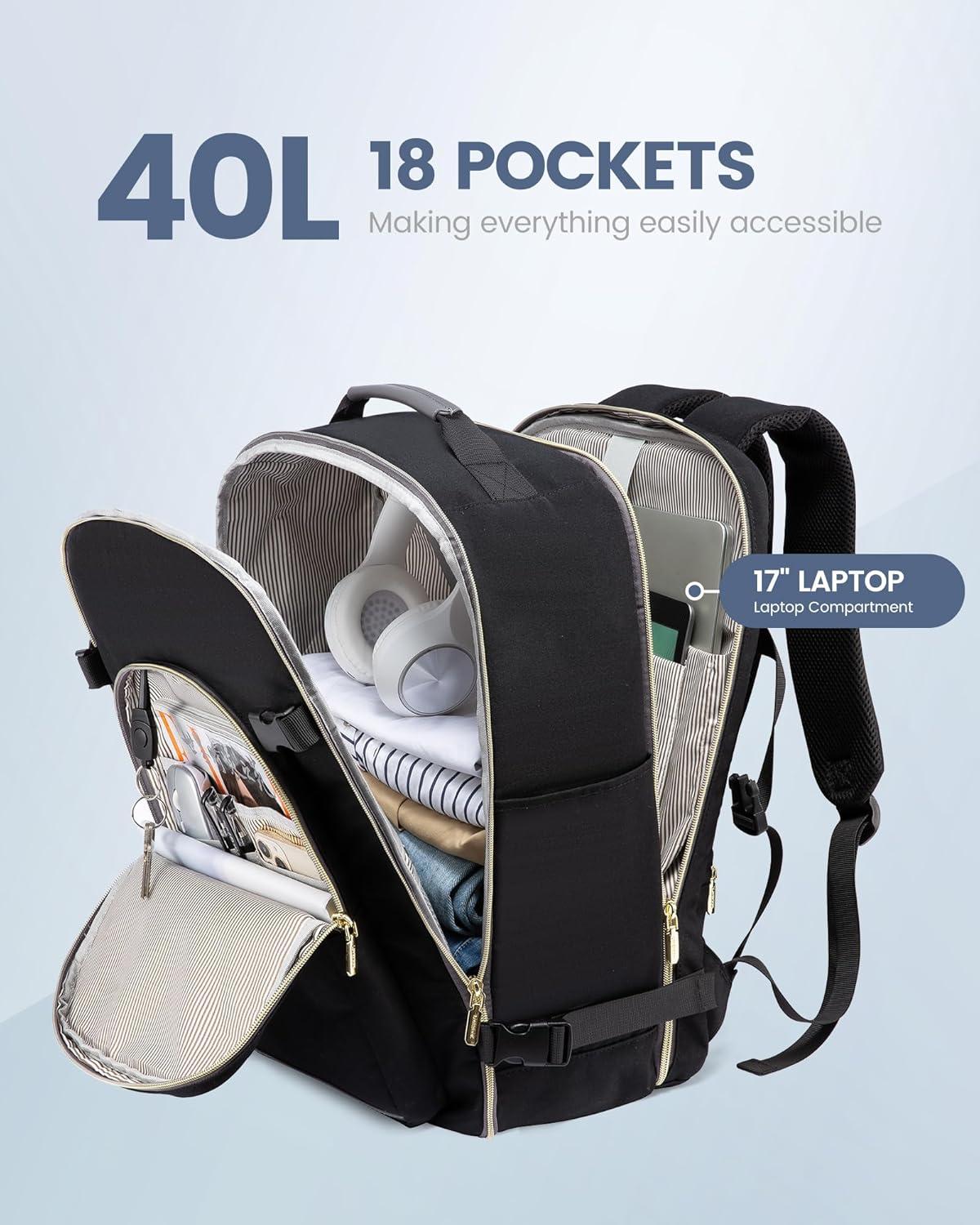 ✈【Large Capacity & Multiple Pockets】: The travel backpack has a 40L large capacity and 4 main compartments, which can meet daily and travel needs. The travel backpack for women's main compartment can store a lot of things, including 5-8 pieces of clothing, shoes, books, and many other items. The separate laptop compartment is padded with EVA foam to provide the best protection for your 17″ laptop and 12.9″ iPad. The front compartment has many pockets to keep your belongings organized.