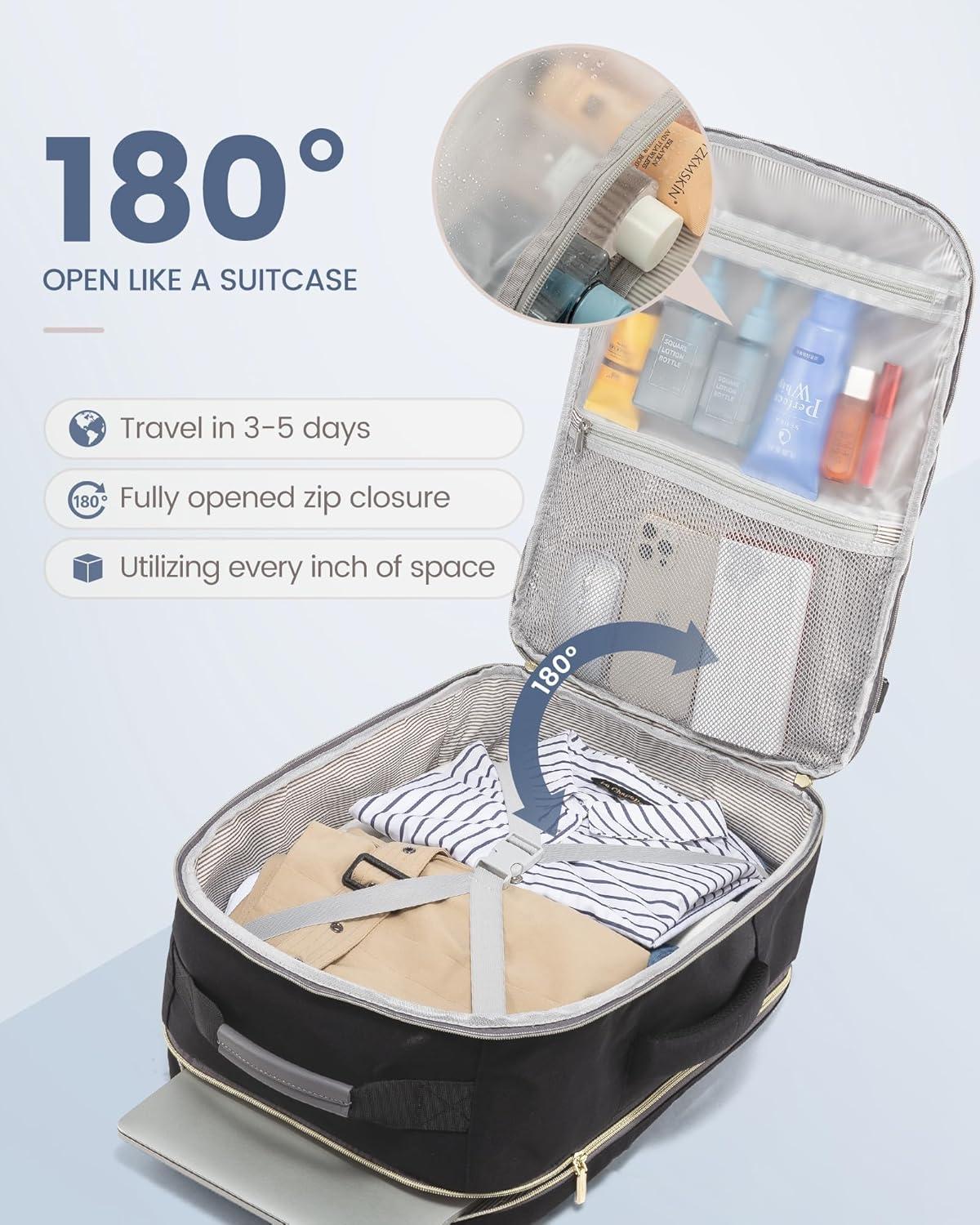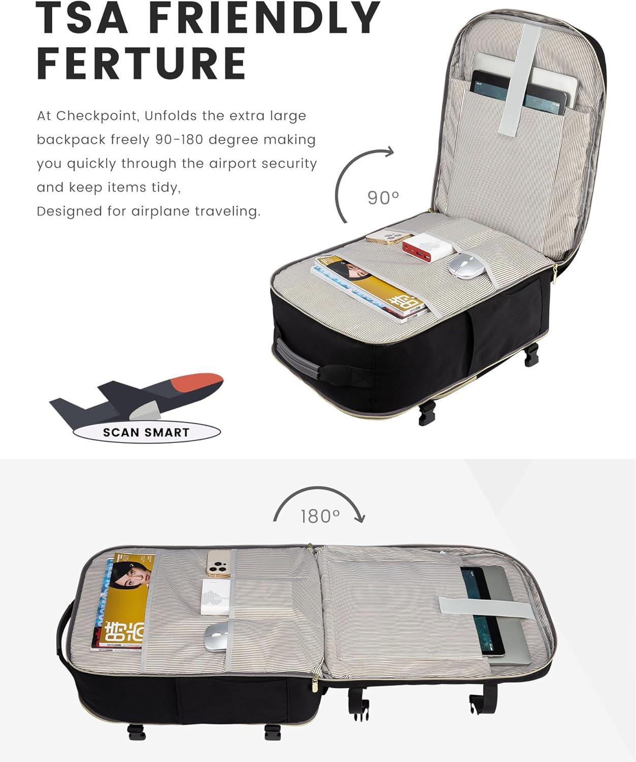 ✈【As Personal Item Airline Approved:】 The size of the carry on backpack is 18*14*8inch. Meets the maximum size allowed by most International Air Transport Association (IATA) flights, and can be placed in the overhead luggage compartment and under seat luggage for airlines, suitable for Spirit, Frontier, Easy Jet, Jet Blue, and other airlines. This travel backpack for women airline approved can be freely opened 90-180 degrees easily and quickly at the airport security check.