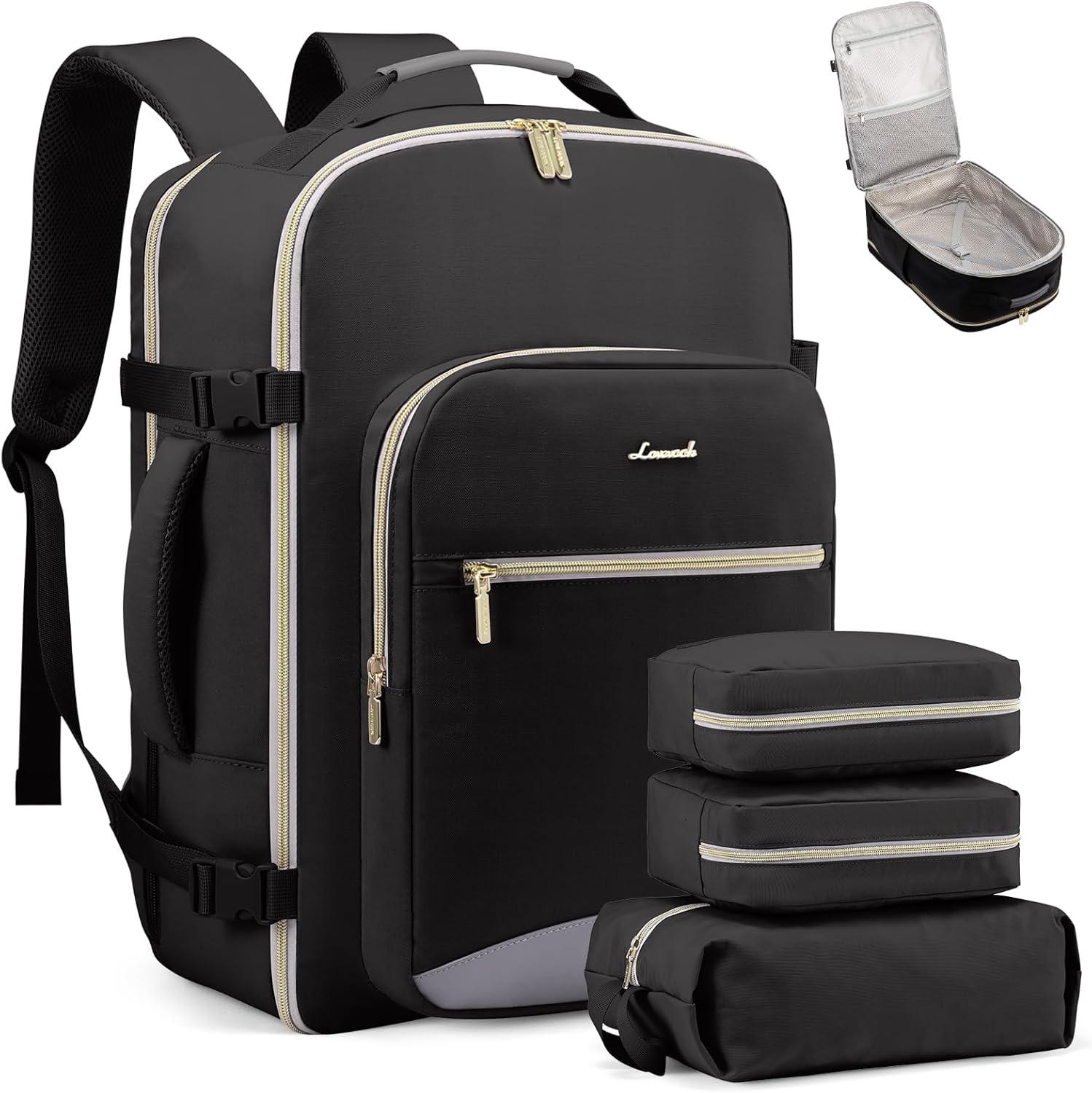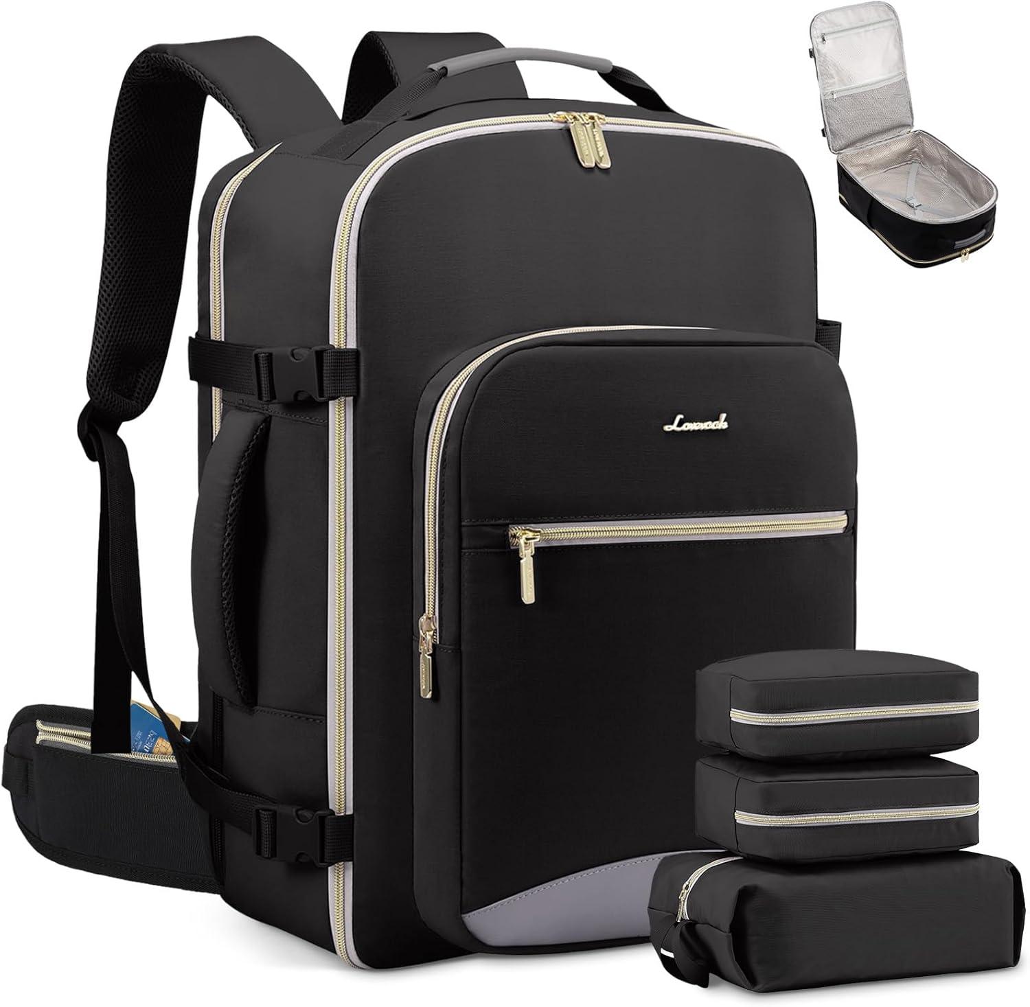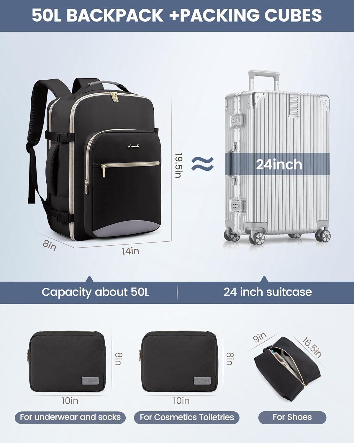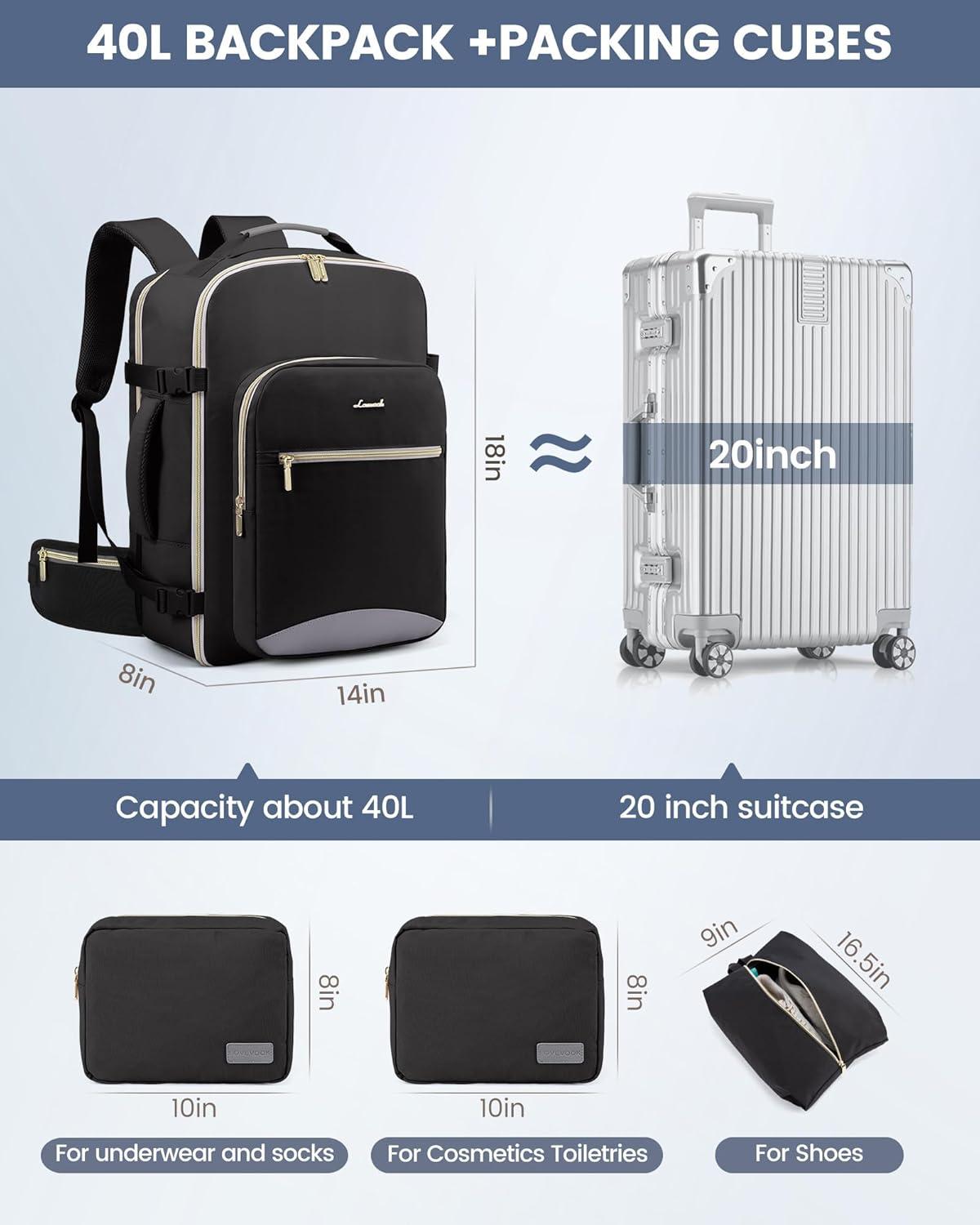 imageLOVEVOOK Travel Backpack for Women ampamp Men 40LAirline Approved Carry On Backpack Travel EssentialsTSA Carry on LuggageWaterproof Personal Item Travel BagSuitcase with 3 Packing CubesLight grayPinkBlackblack