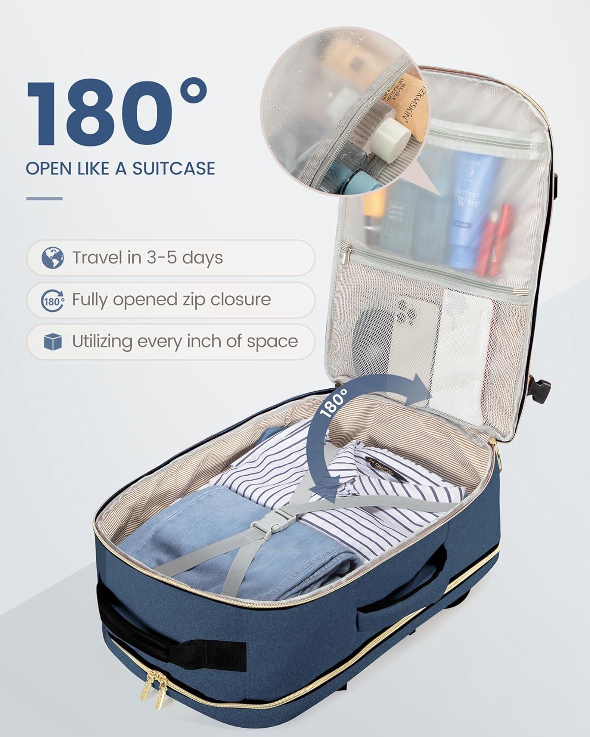 ✈【As Personal Item Airline Approved:】 The size of the carry on backpack is 18*14*8inch. Meets the maximum size allowed by most International Air Transport Association (IATA) flights, and can be placed in the overhead luggage compartment and under seat luggage for airlines, suitable for Spirit, Frontier, Easy Jet, Jet Blue, and other airlines. This travel backpack for women airline approved can be freely opened 90-180 degrees easily and quickly at the airport security check.