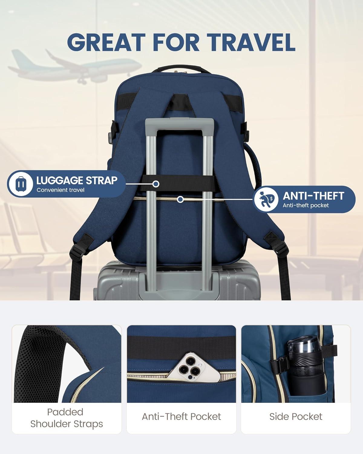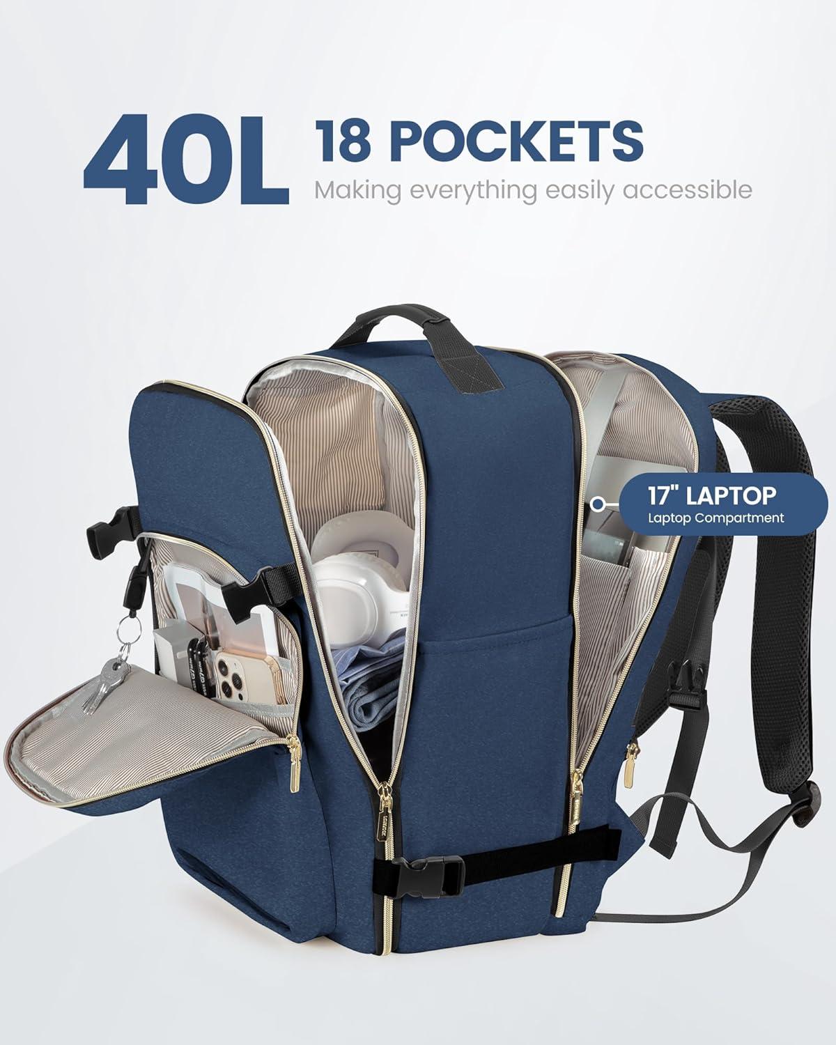 ✈【Large Capacity & Multiple Pockets】: The travel backpack has a 40L large capacity and 4 main compartments, which can meet daily and travel needs. The travel backpack for women's main compartment can store a lot of things, including 5-8 pieces of clothing, shoes, books, and many other items. The separate laptop compartment is padded with EVA foam to provide the best protection for your 17″ laptop and 12.9″ iPad. The front compartment has many pockets to keep your belongings organized.