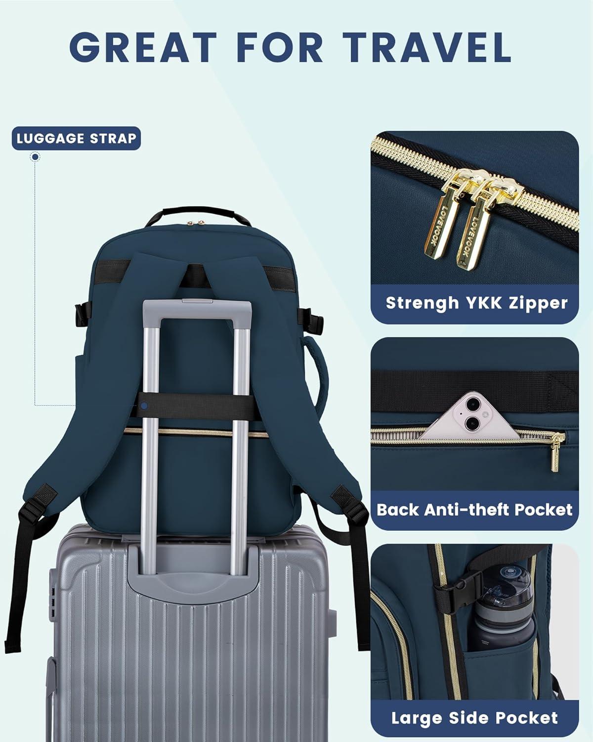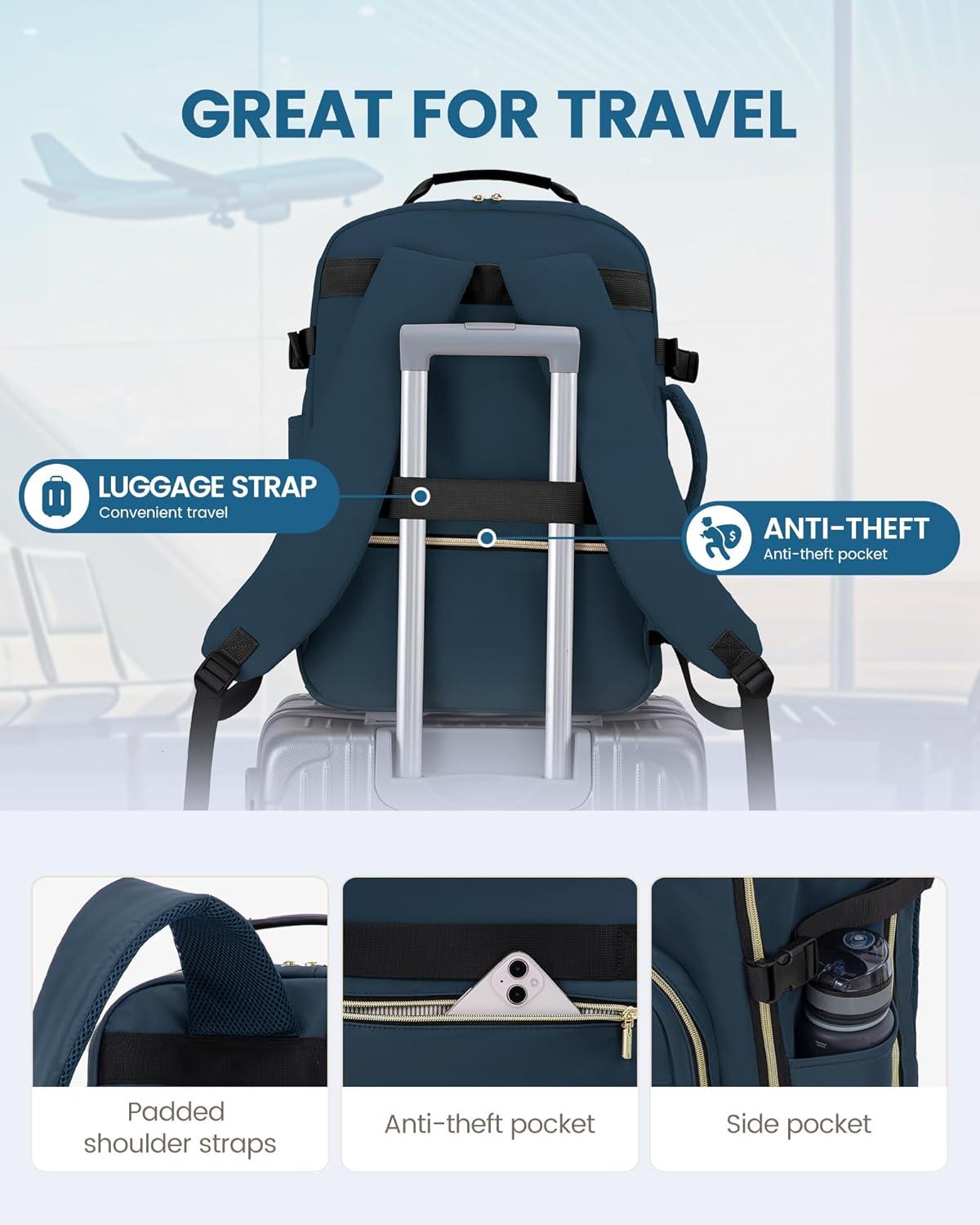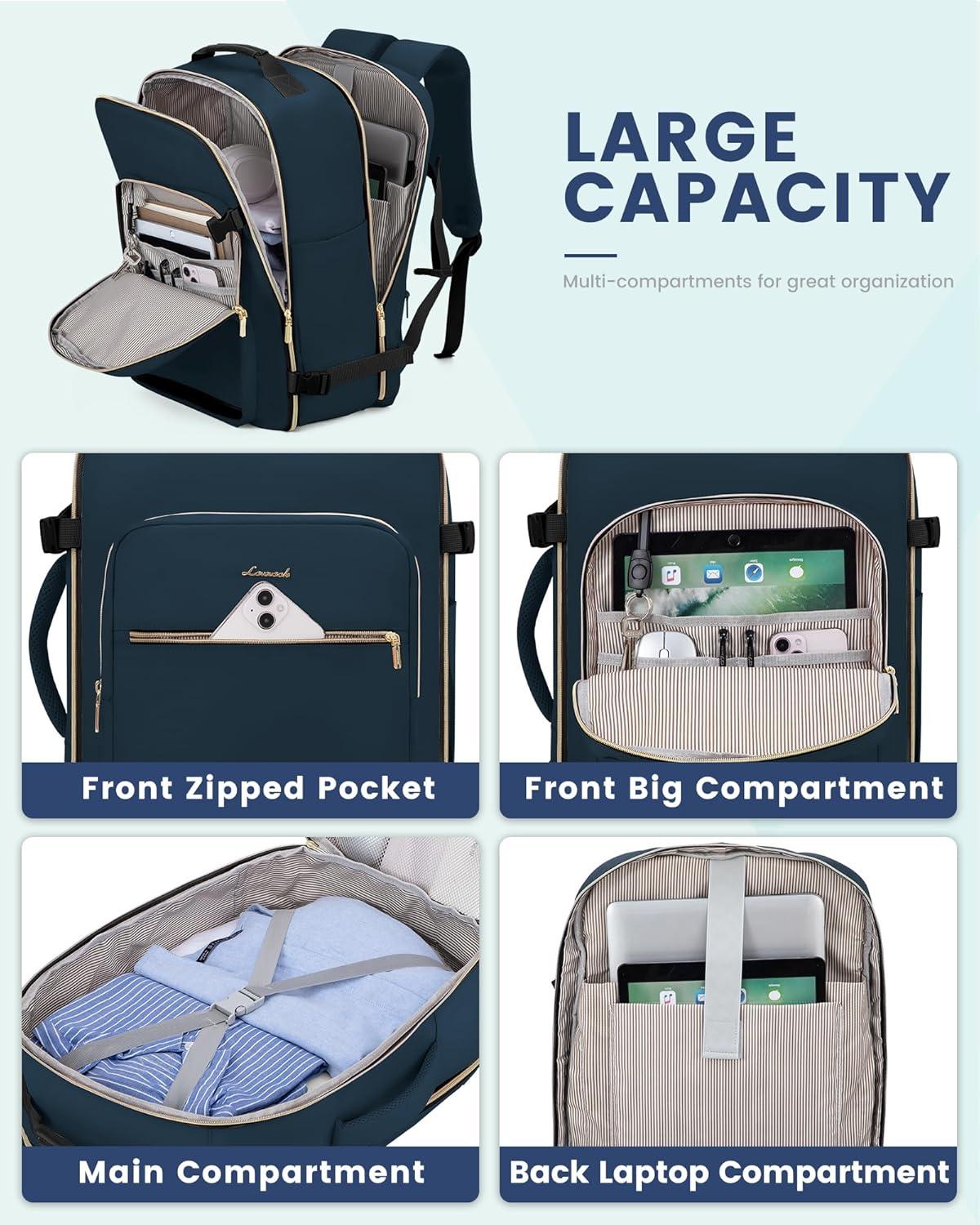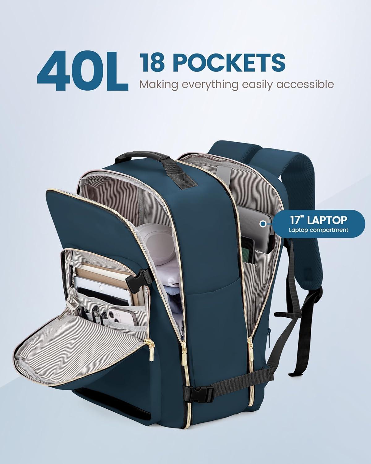 ✈【Large Capacity & Multiple Pockets】: The travel backpack has a 40L large capacity and 4 main compartments, which can meet daily and travel needs. The travel backpack for women's main compartment can store a lot of things, including 5-8 pieces of clothing, shoes, books, and many other items. The separate laptop compartment is padded with EVA foam to provide the best protection for your 17″ laptop and 12.9″ iPad. The front compartment has many pockets to keep your belongings organized.