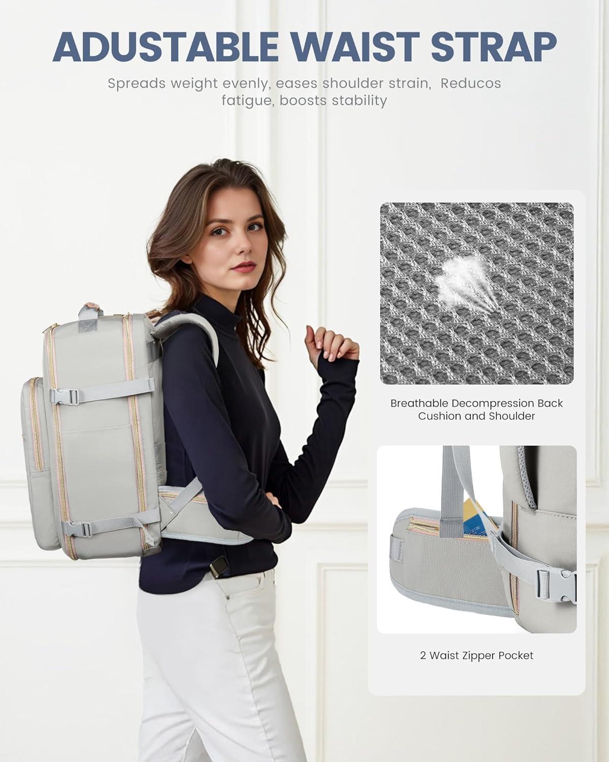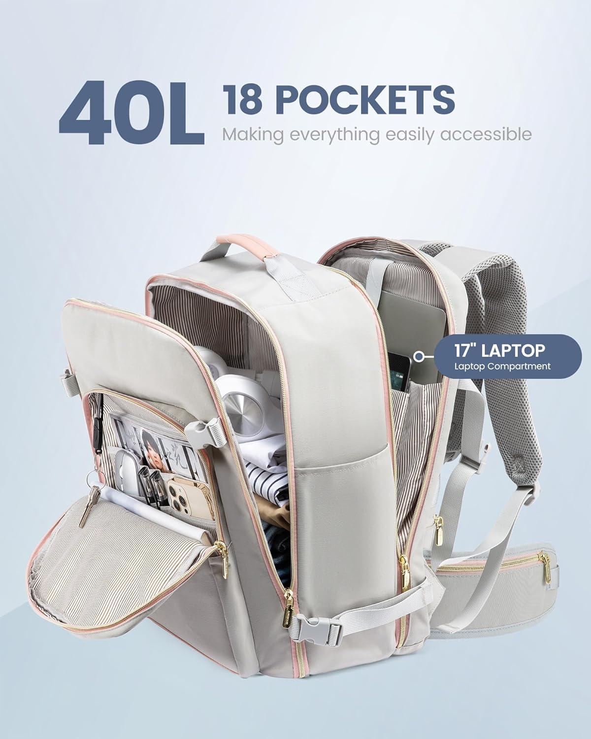 ✈【Large Capacity & Multiple Pockets】: The travel backpack has a 40L large capacity and 4 main compartments, which can meet daily and travel needs. The travel backpack for women's main compartment can store a lot of things, including 5-8 pieces of clothing, shoes, books, and many other items. The separate laptop compartment is padded with EVA foam to provide the best protection for your 17″ laptop and 12.9″ iPad. The front compartment has many pockets to keep your belongings organized.