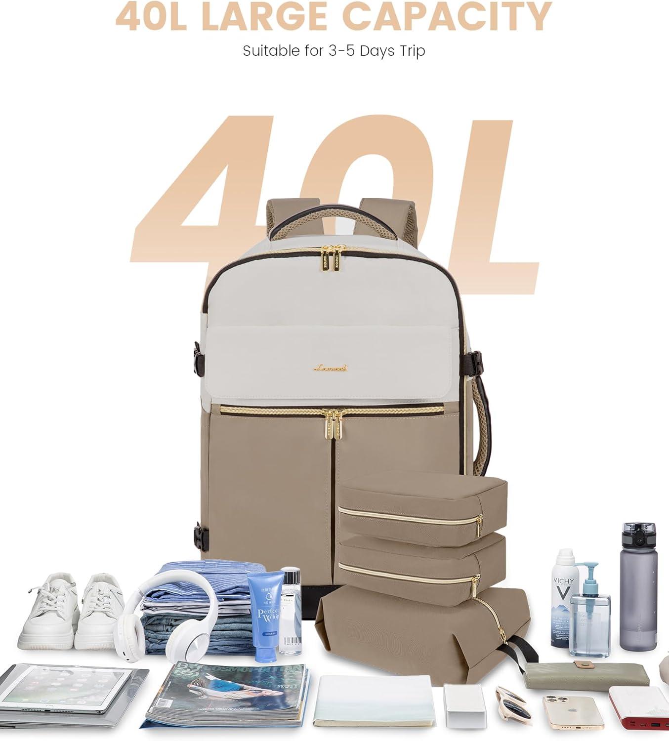 imageLOVEVOOK Travel Backpack for Women TSA Carry On Backpack Flight Approved Luggage 40L Water Resistant Personal Item Daypack Large Weekender Bag fit 17 inch Laptop with 3 Cubes BeigeblackbrownBeigekhakiblack