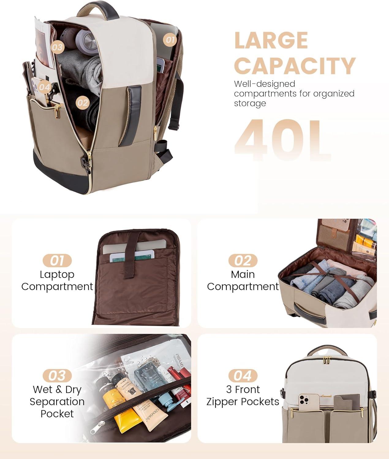 Carry On Backpack for Women: One of the standout features of this travel backpack is its 40L large-capacity design, which includes 14 pockets, separate laptop compartment fits 17 inch laptop, for easy organization and storage. Whether you're packing for a weekend getaway or a longer trip, you'll have ample space to pack all your travel essentials, from clothing and toiletries to books and gadgets.