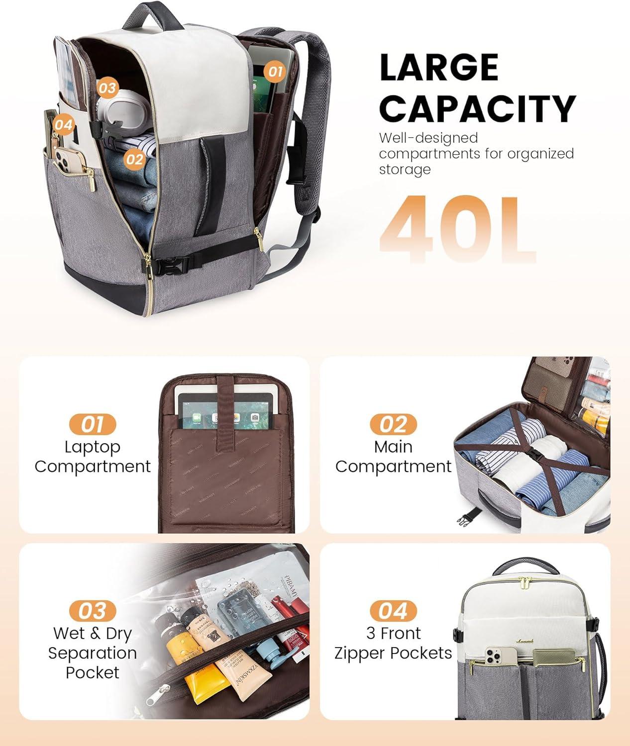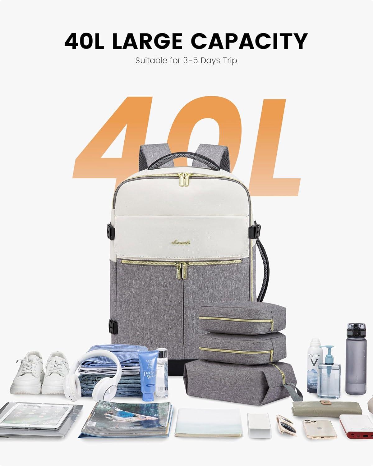 Carry On Backpack for Women: One of the standout features of this travel backpack is its 40L large-capacity design, which includes 14 pockets, separate laptop compartment fits 17 inch laptop, for easy organization and storage. Whether you're packing for a weekend getaway or a longer trip, you'll have ample space to pack all your travel essentials, from clothing and toiletries to books and gadgets.