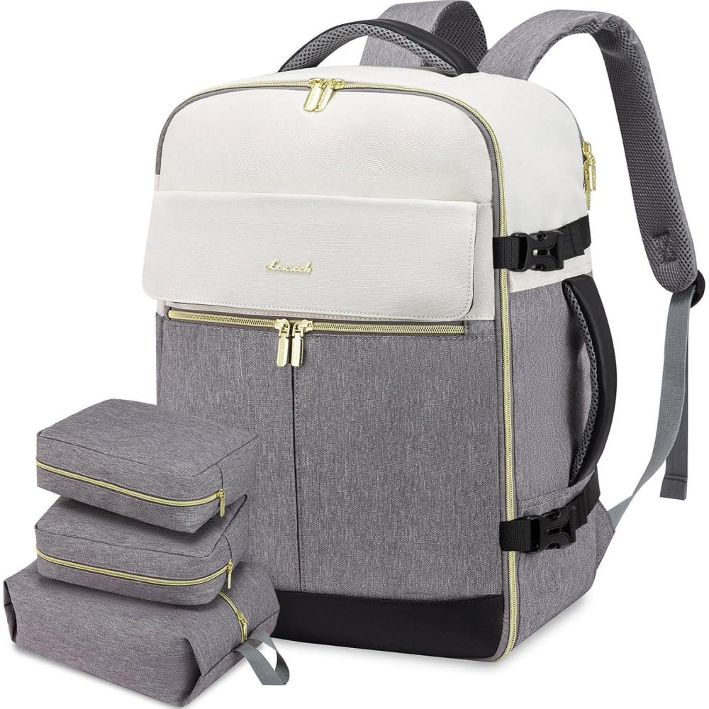 LOVEVOOK Travel Backpack for Women, TSA Carry On Backpack Flight Approved Luggage, 40L Water Resistant Personal Item Daypack Large Weekender Bag fit 17 inch Laptop with 3 Cubes, Beige-black-brown(Beige Grey)