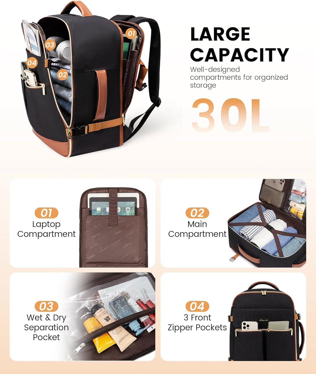 Carry On Backpack for Women: One of the standout features of this travel backpack is its 40L large-capacity design, which includes 14 pockets, separate laptop compartment fits 17 inch laptop, for easy organization and storage. Whether you're packing for a weekend getaway or a longer trip, you'll have ample space to pack all your travel essentials, from clothing and toiletries to books and gadgets.