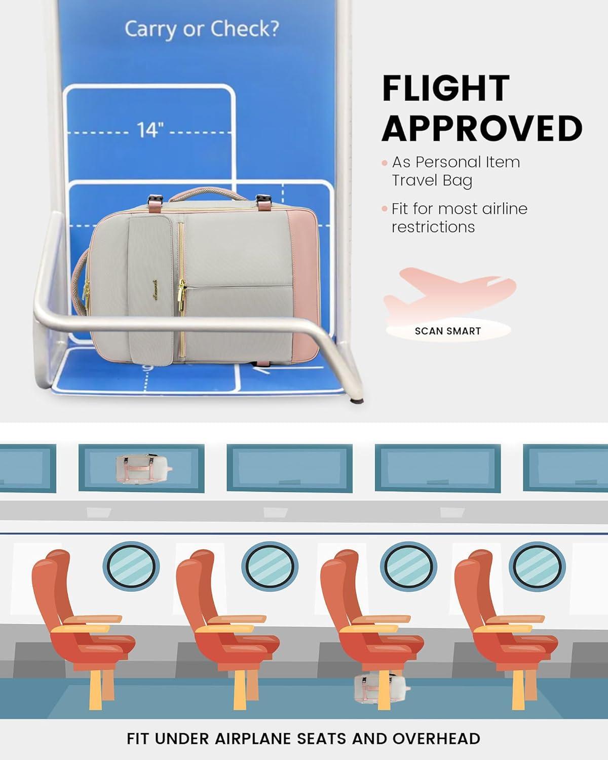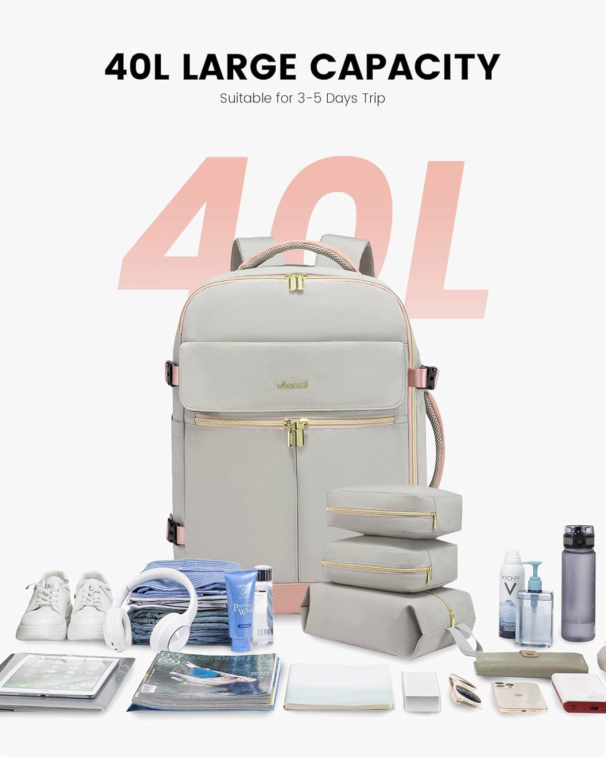 LOVEVOOK Travel Backpack For Women, 40L Carry On Backpack Flight Approved, TSA Personal Item Travel Bag Fits 17 Inch Laptop, Business Weekender Overnight Waterproof Daypack With 2 Cubes, Grey-Pink(Beige)
