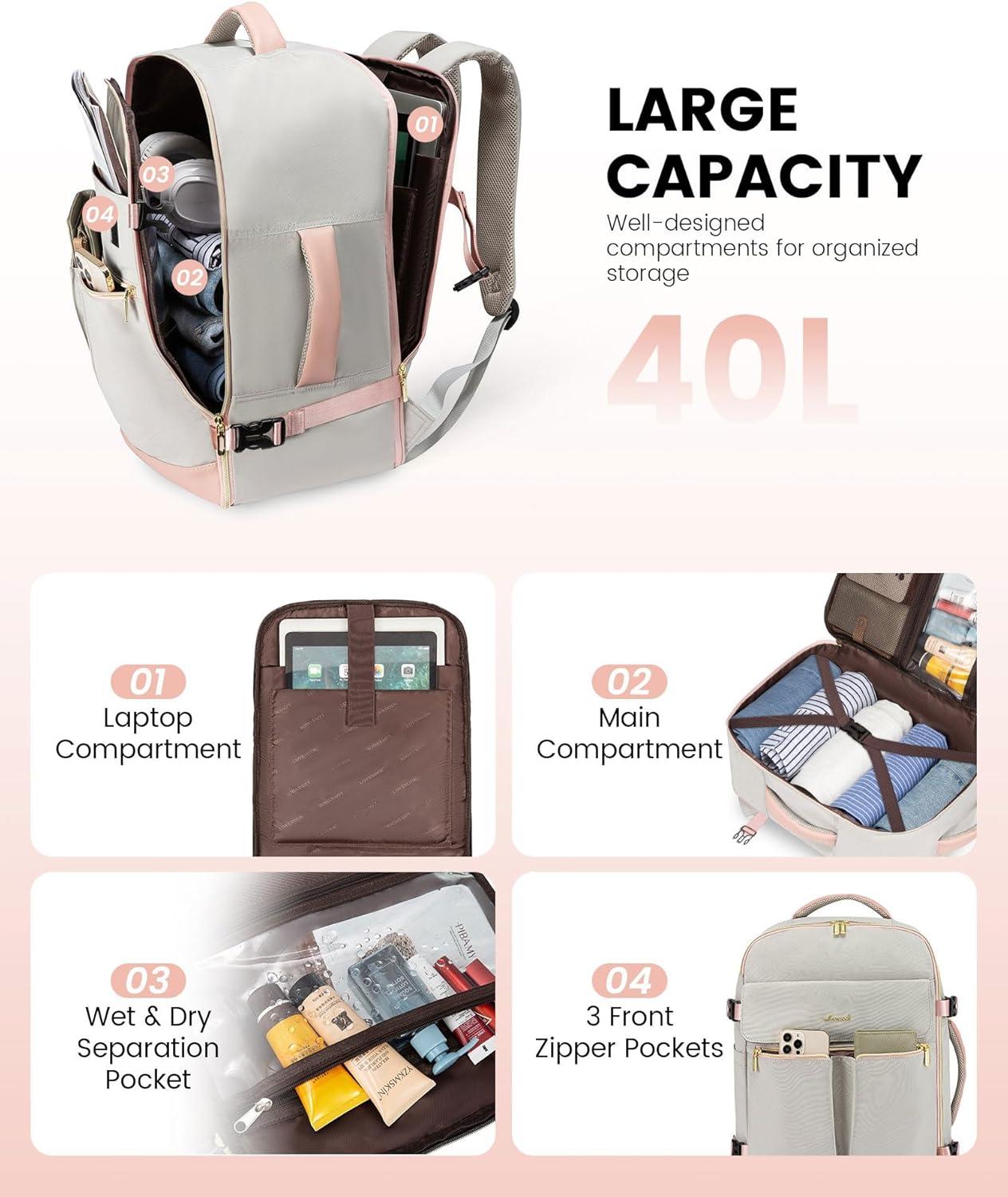 Carry On Backpack for Women: One of the standout features of this travel backpack is its 40L large-capacity design, which includes 14 pockets, separate laptop compartment fits 17 inch laptop, for easy organization and storage. Whether you're packing for a weekend getaway or a longer trip, you'll have ample space to pack all your travel essentials, from clothing and toiletries to books and gadgets.