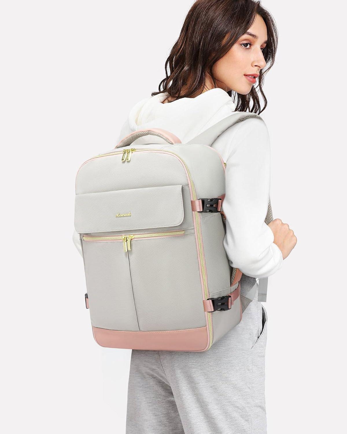 imageLOVEVOOK Travel Backpack For Women 40L Carry On Backpack Flight Approved TSA Personal Item Travel Bag Fits 17 Inch Laptop Business Weekender Overnight Waterproof Daypack With 2 Cubes GreyPinkBeige