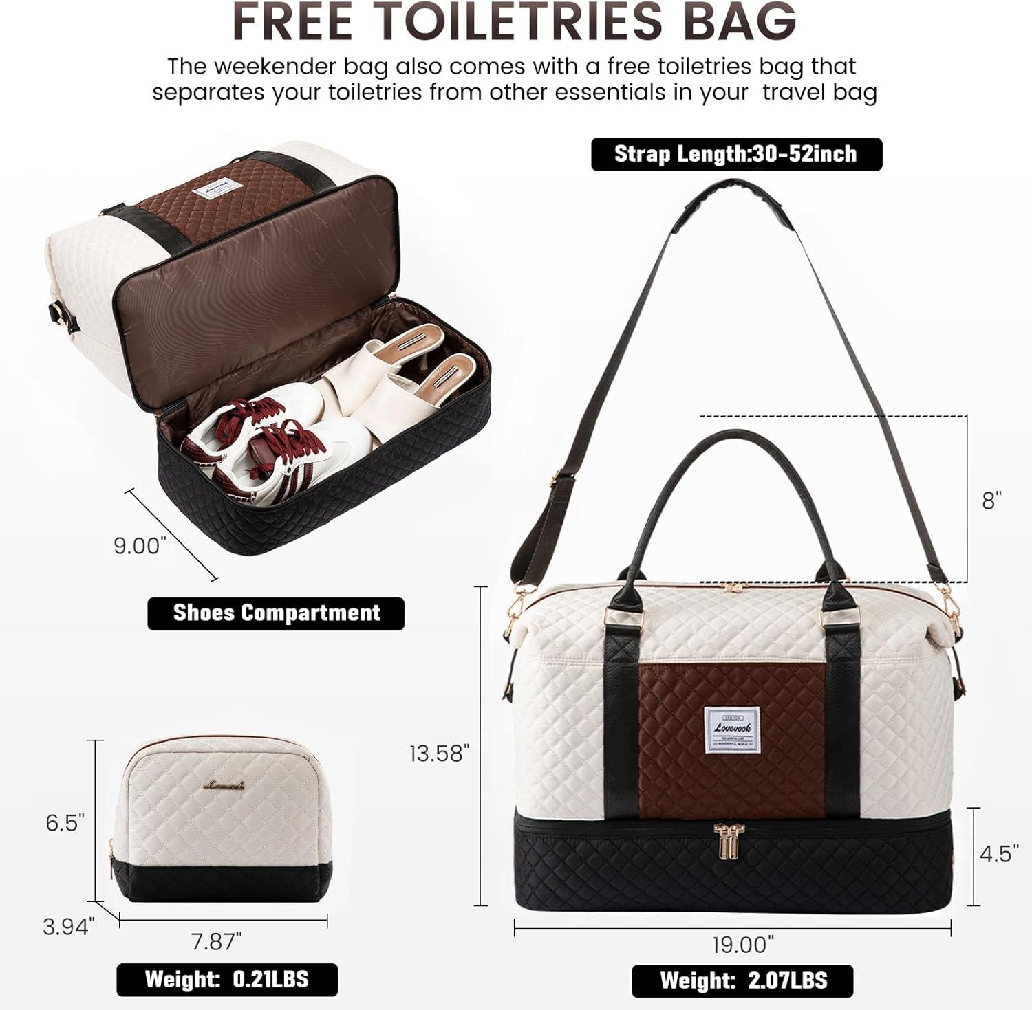 imageLOVEVOOK Travel Duffle BagWeekender Bags for Women with Shoe CompartmentCarry on Overnight Bag with Toiletry BagGym Duffel Bag with Wet Pocket Hospital Bags for Labor and DeliveryBlackwhitebrowna