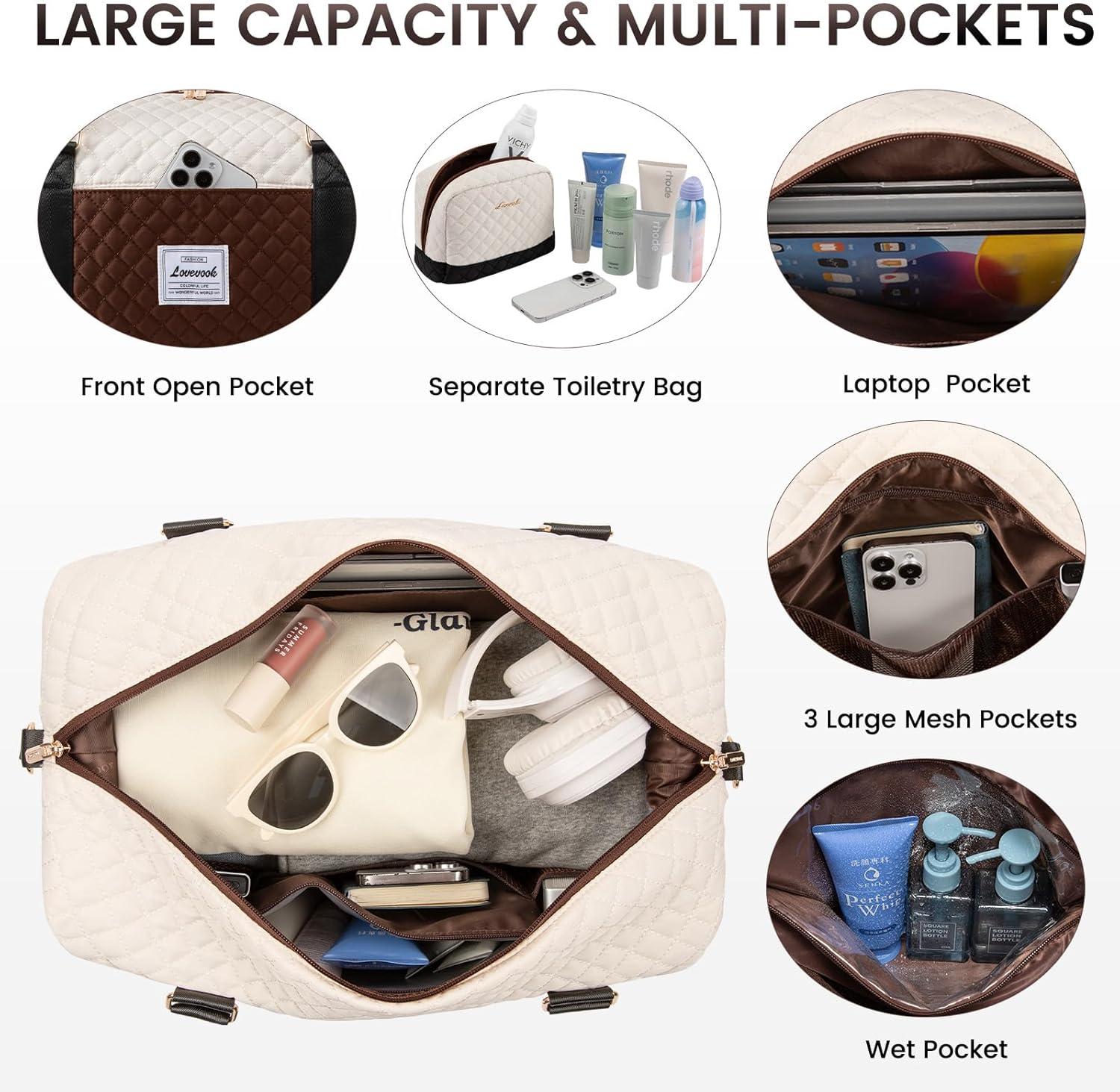 LOVEVOOK Travel Duffle Bag,Weekender Bags for Women with Shoe Compartment,Carry on Overnight Bag with Toiletry Bag,Gym Duffel Bag with Wet Pocket, Hospital Bags for Labor and Delivery(Black&white&brown-a)